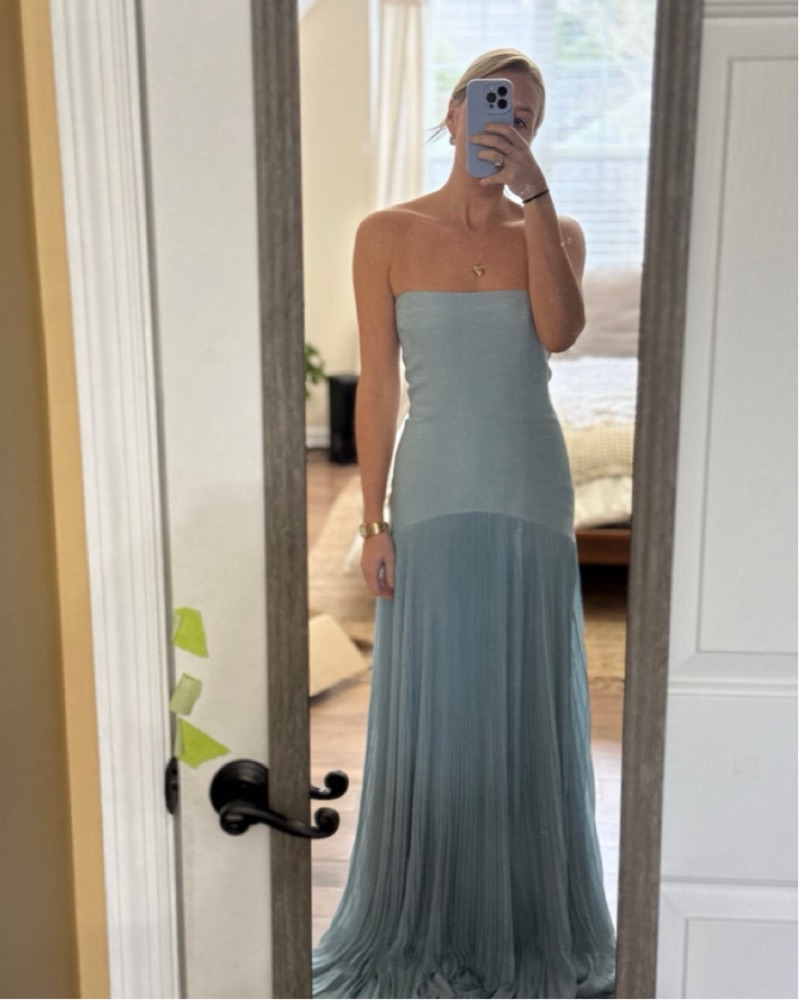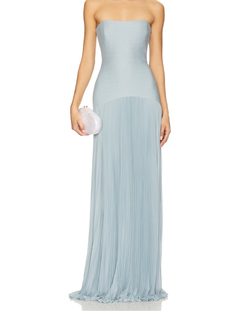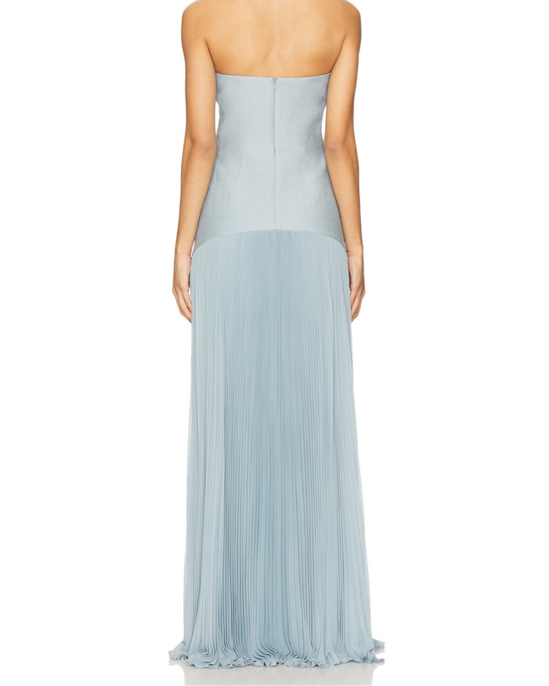 Sold out everywhere, gorgeous powder blue! The Sunniva Dress is a graceful strapless gown that effortlessly combines simplicity and elegance. The fitted bodice accentuates the waist, while the floor-length pleated skirt creates beautiful movement with every step.