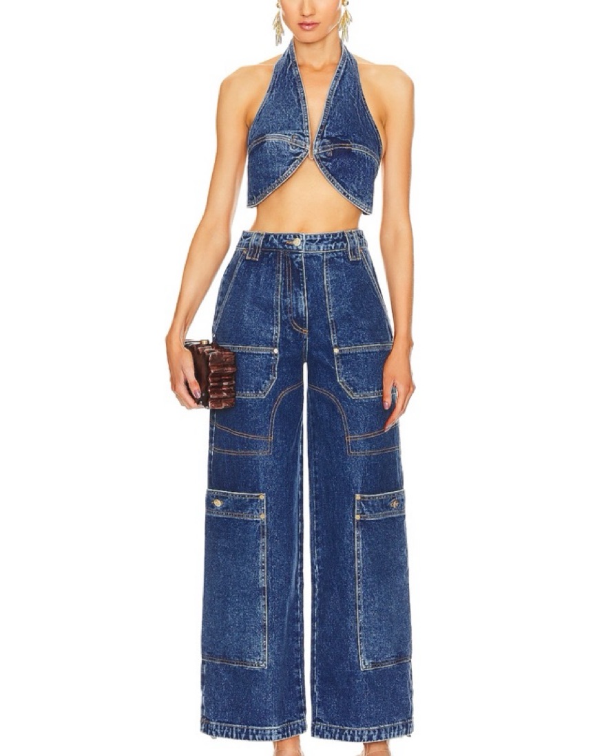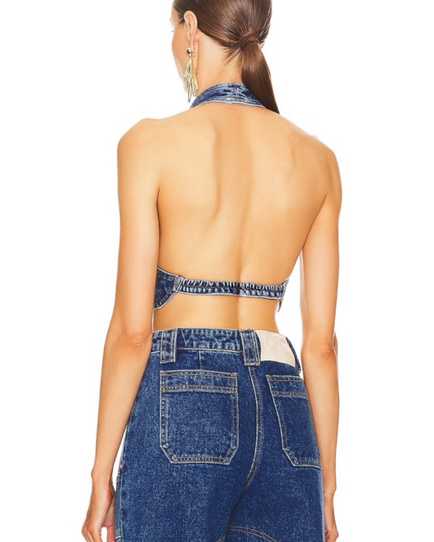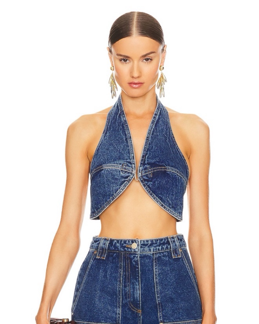 Super high quality denim top with front hook closure. This indigo-hued take on a Cult Gaia favorite is guaranteed to please with her contrast denim top stitching, elastic back, and central bust hardware. This halter top pairs perfectly with the Wynn pant in denim (I also have these to rent)
