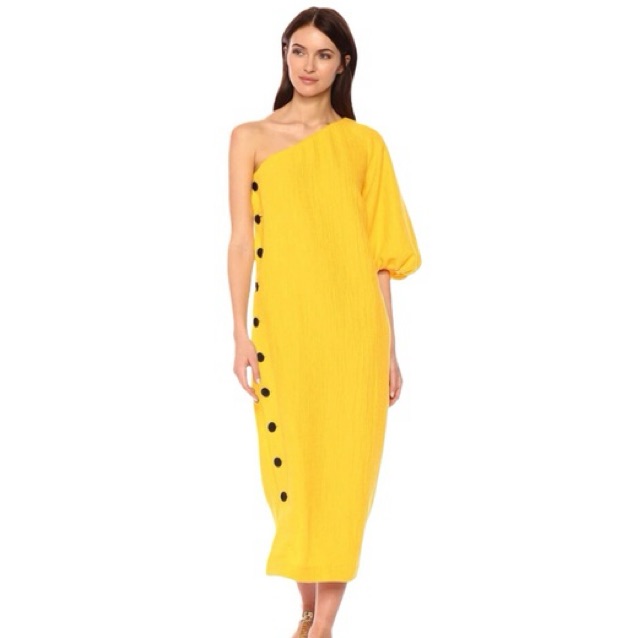 Emilie one shoulder dress, buttons can be undone on sides to make a slit