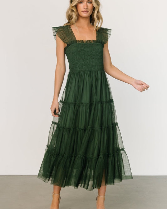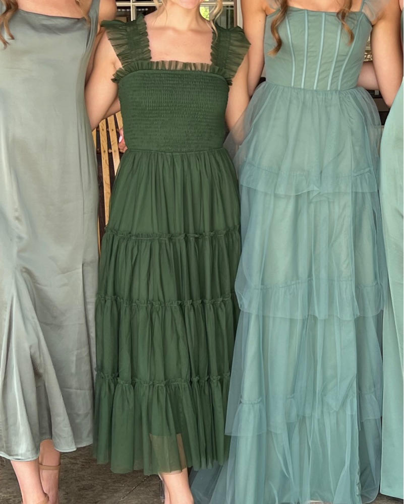 This stunning green tulle dress is perfect for a formal event or wedding. The tiered skirt and flutter sleeves add a touch of romance and elegance.