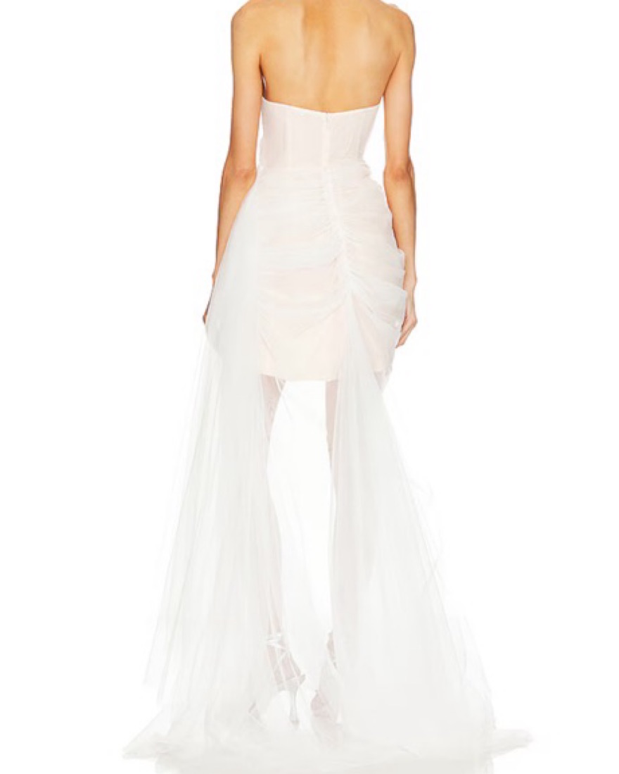 Partially lined Hidden back zipper closure Boned bodice Midweight tulle fabric overlay with train detail Neckline to hem measures approx 60" in length