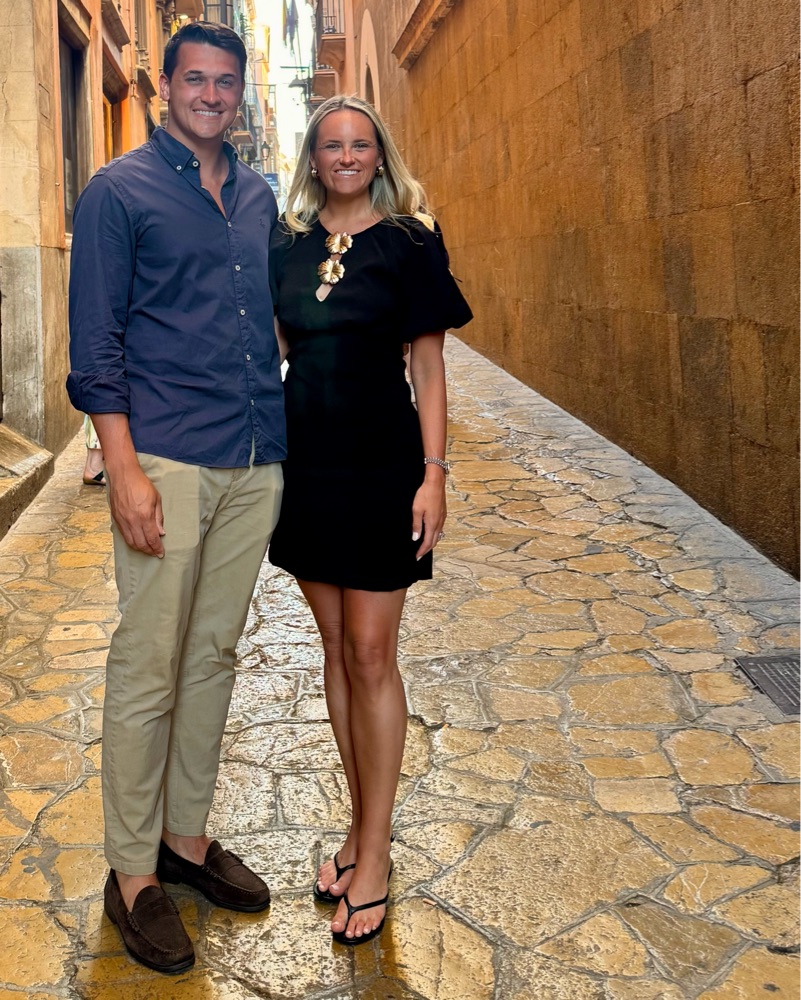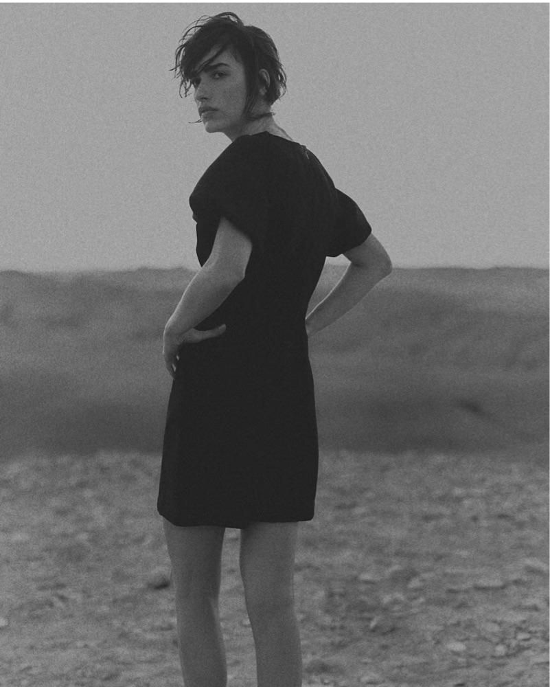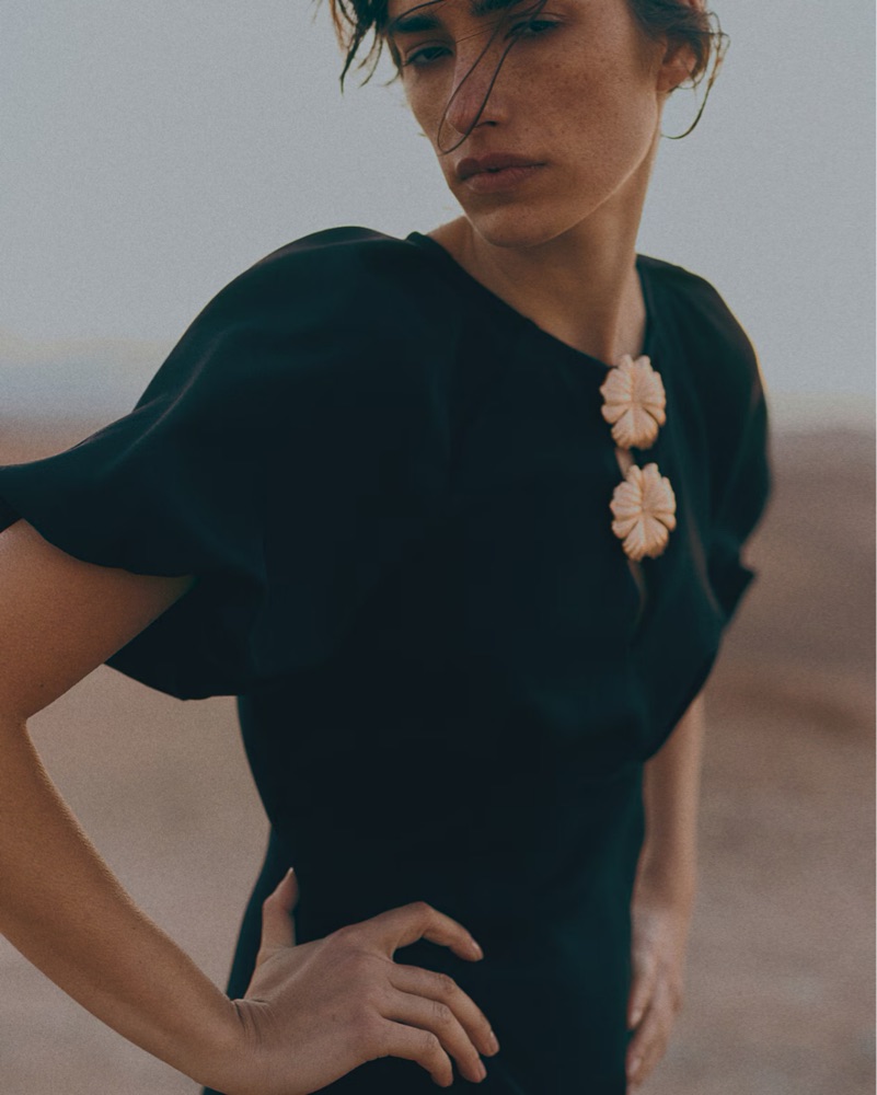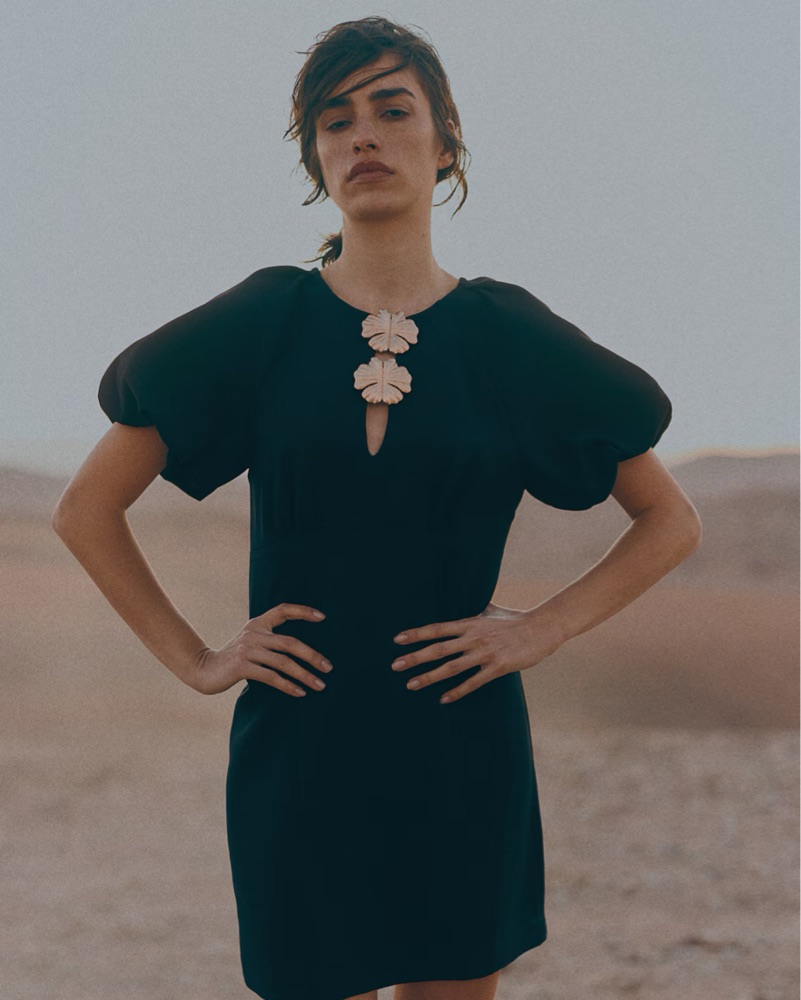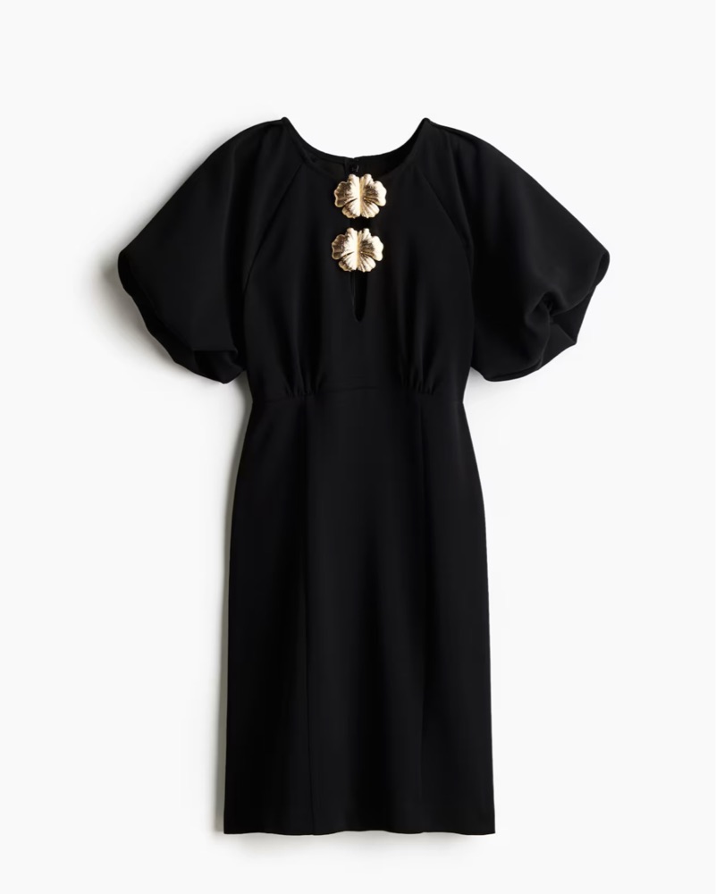 Short fitted dress with woven fabric and short shaping seams at front and back for a flattering silhouette. Round neckline, slit opening with 2 flower-shaped metal details and a concealed zipper at back with hook. Gathered seam below bust. Inverted box pleats on shoulders, short balloon sleeves