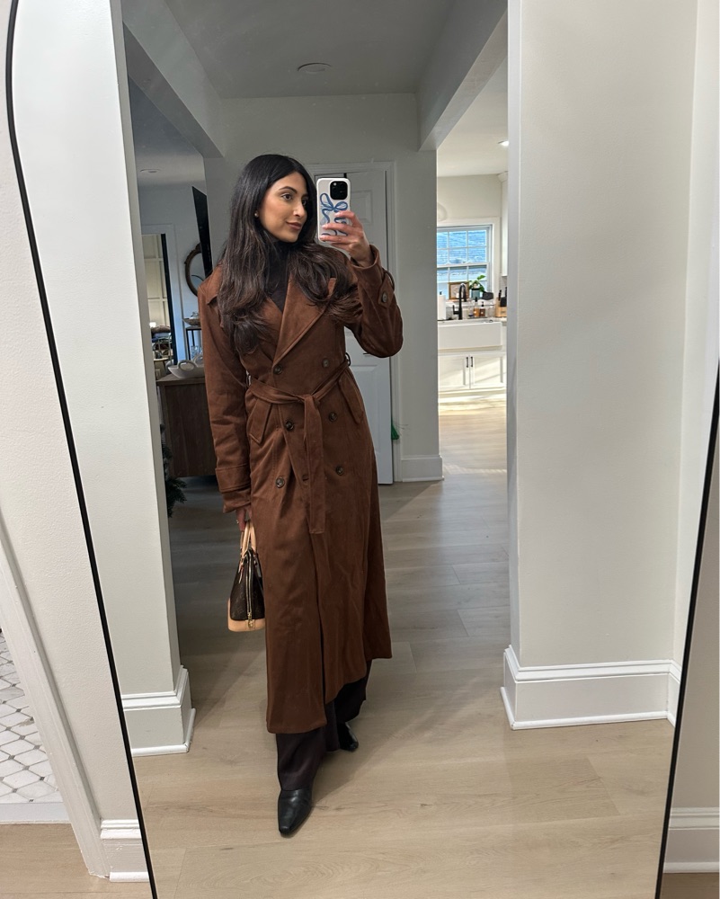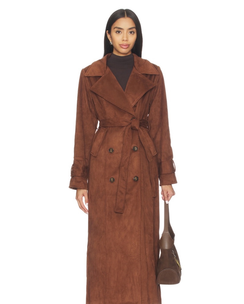 This luxurious suede trench coat exudes elegance and sophistication. It's perfect for adding a touch of glamour to any outfit, whether you're dressing up for a special occasion or need a stylish outerwear piece for a casual day out.