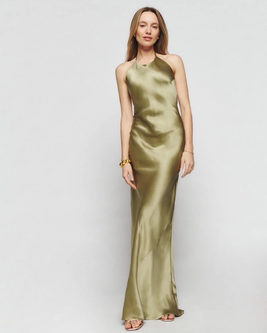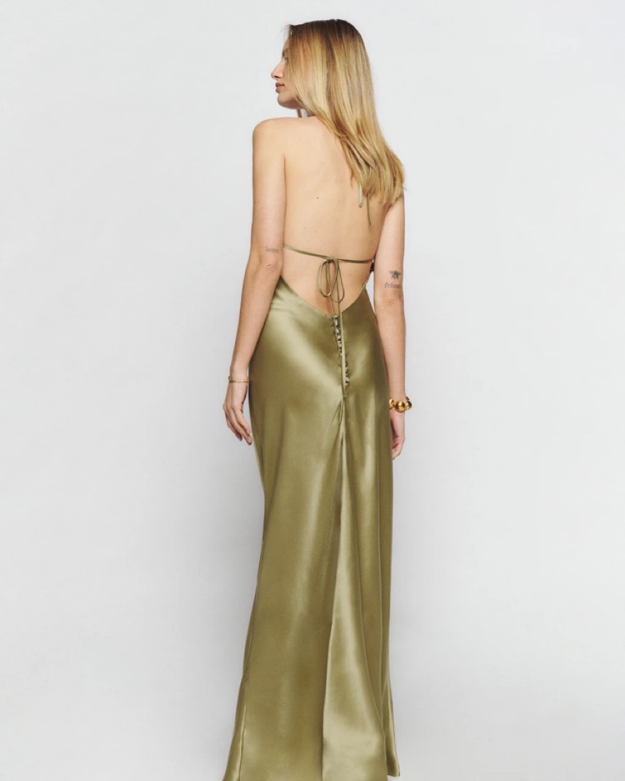Reformation Jeany Silk Dress in olive oil. There are slight pulls and small holes near the bottom in the back, but they’re barely noticeable when worn.
