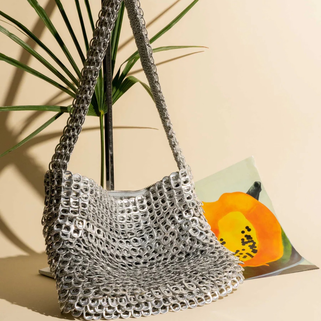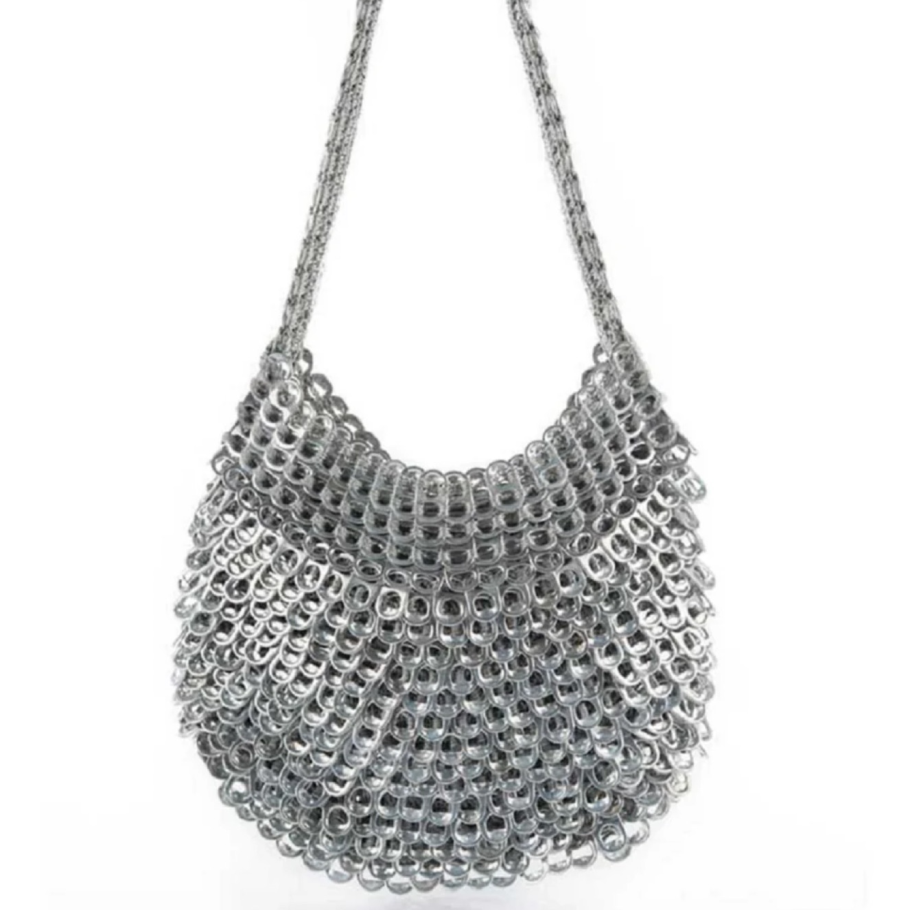 Metallic 'chainmail fabric' hand crocheted from up-cycled aluminum tabs.