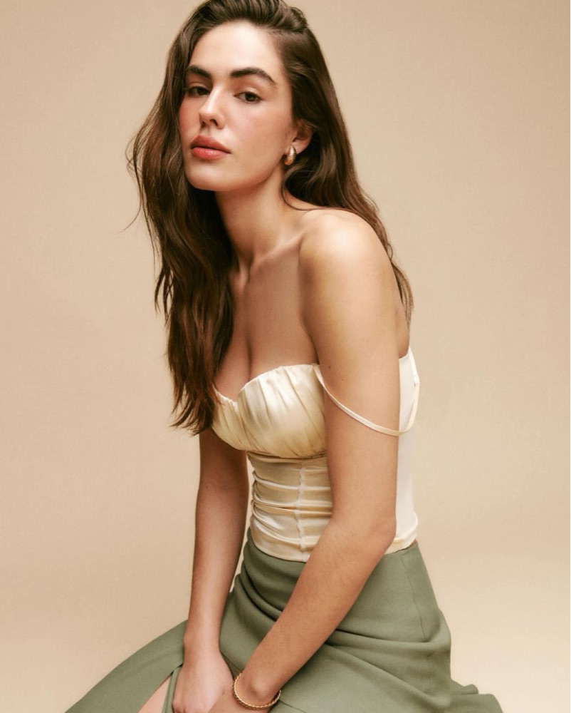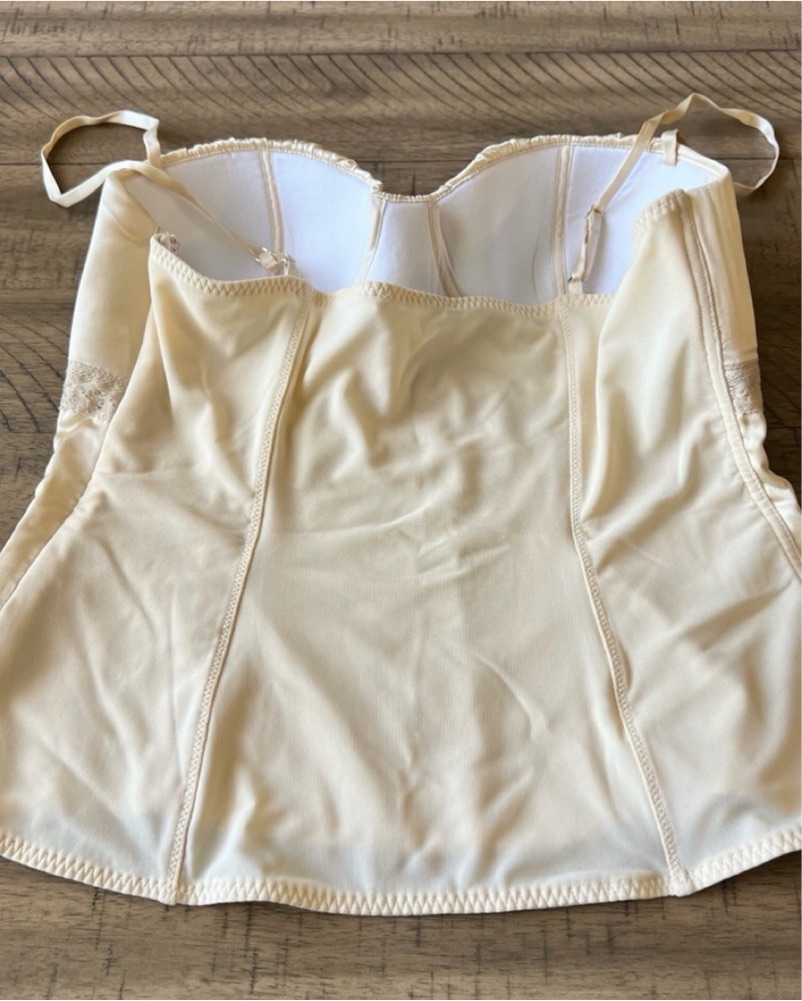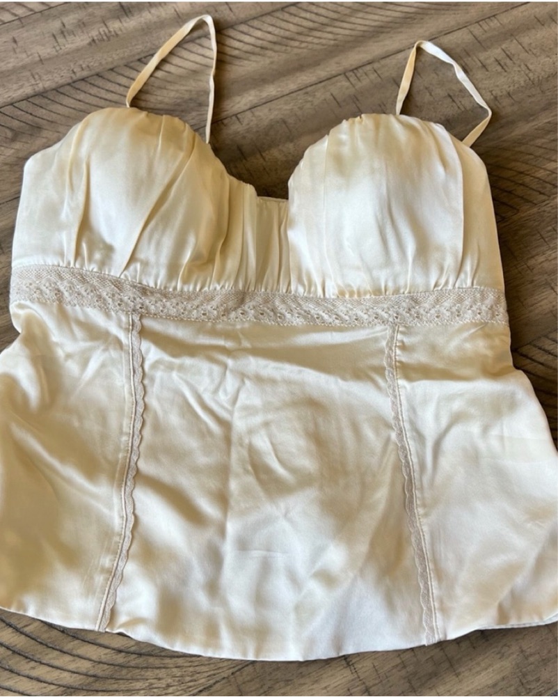 super flattering, bust is lined and padded so no need for bra. recommend for bigger cup size. the back is mesh so super breathable and perfect for summer. color is pale/ butter yellow, champagne.