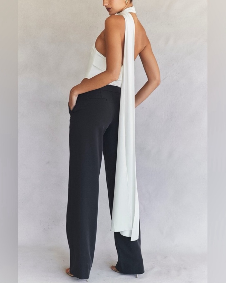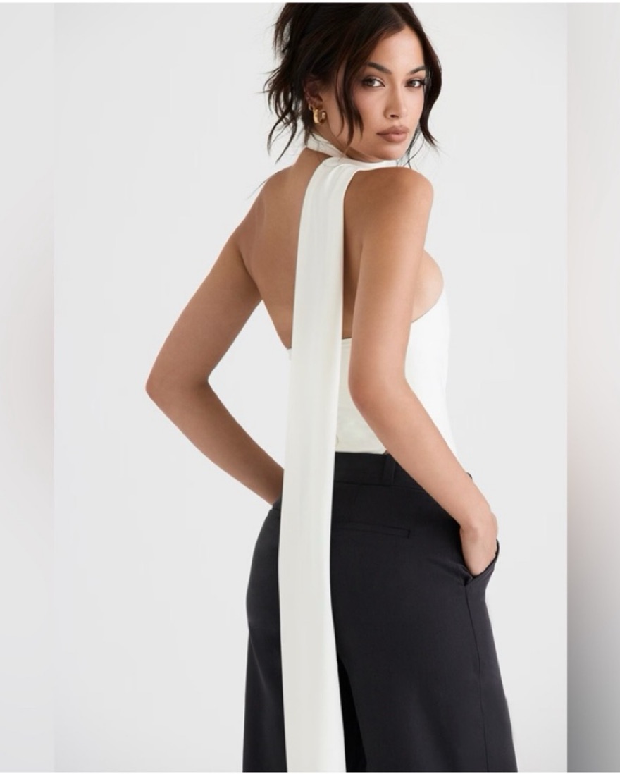 House of CB Farrah White Ivory Satin Wrap Neck Bodysuit. I am obsessed with this top!