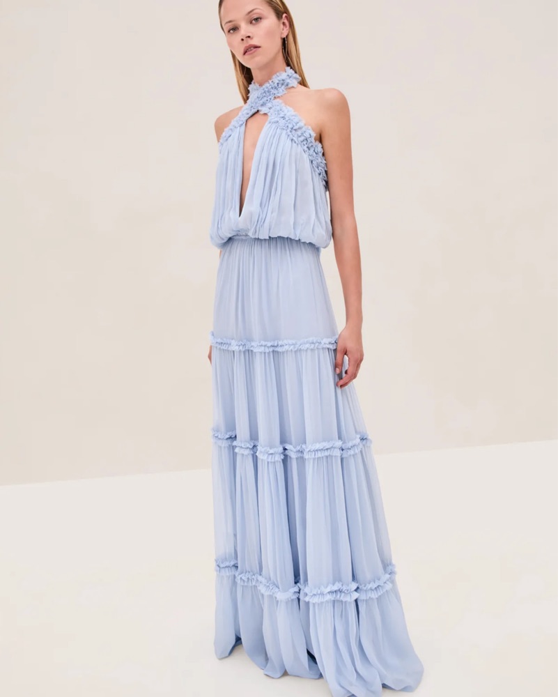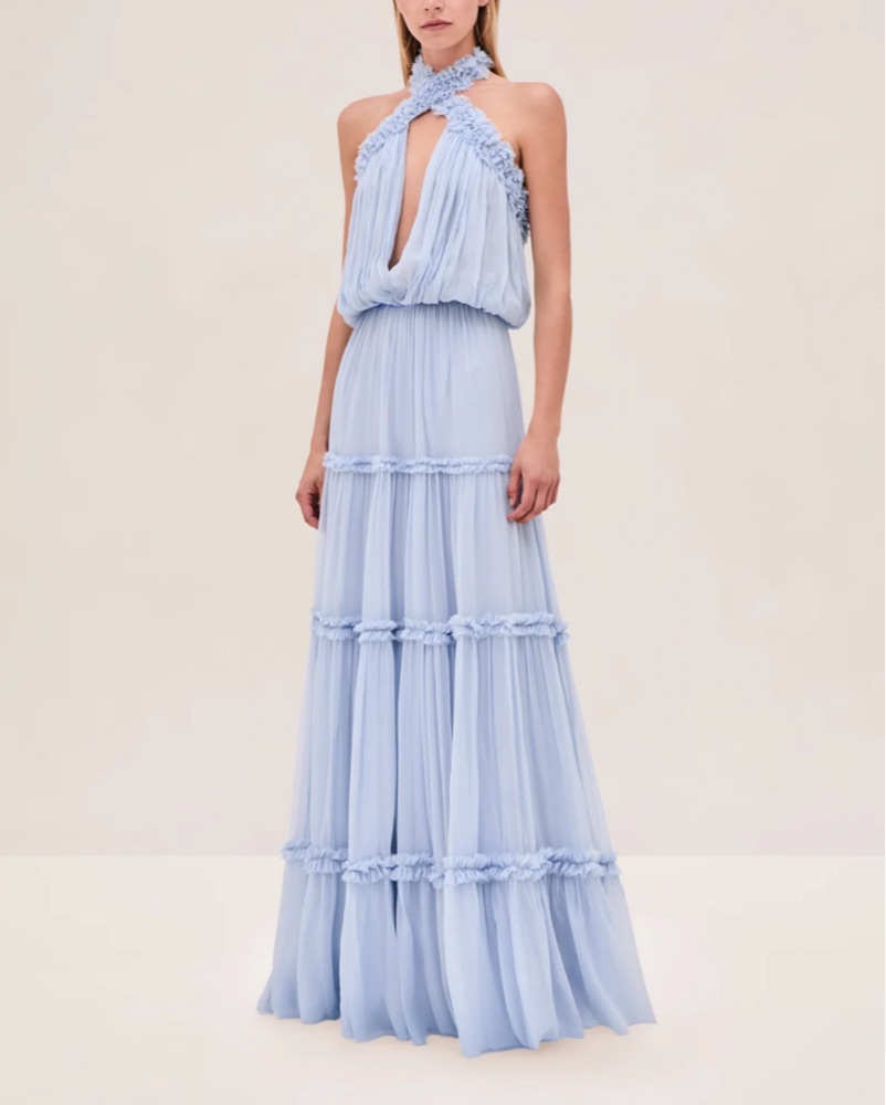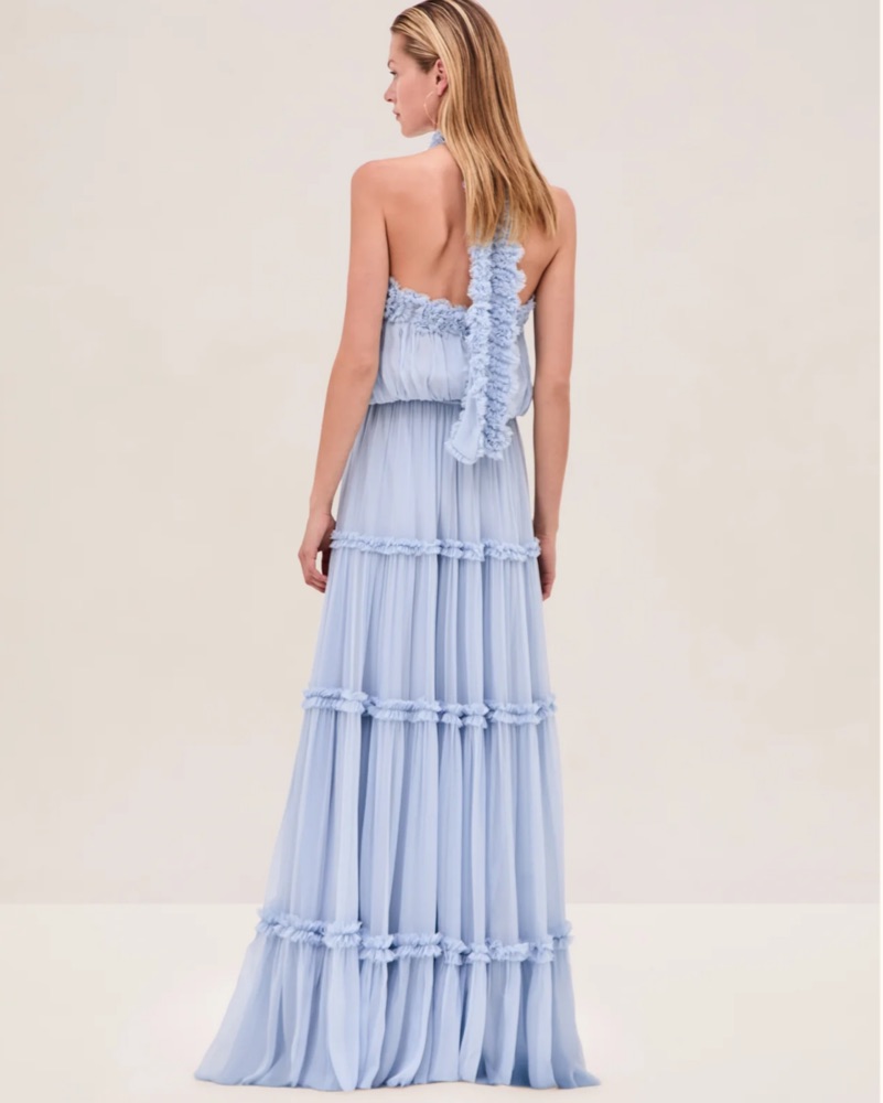 The Izbelle Dress is a crinkled chiffon gown featuring tiered, ruffled accents and a floral halter detail at the neckline. Size runs big, is xxs but fits xs/s.