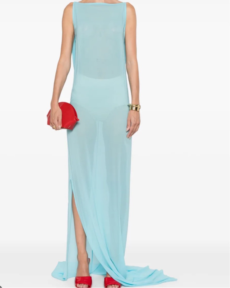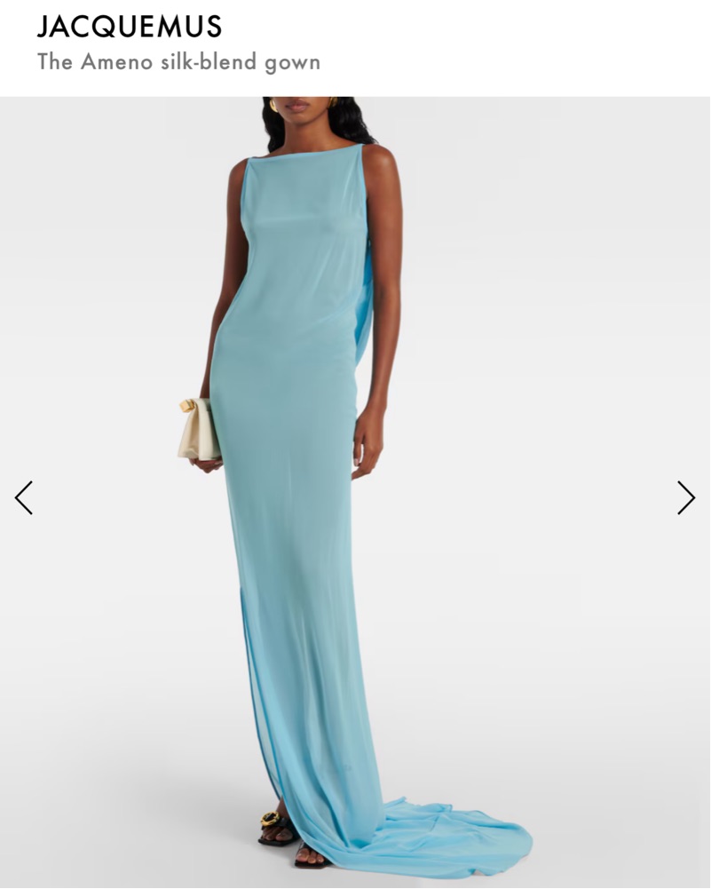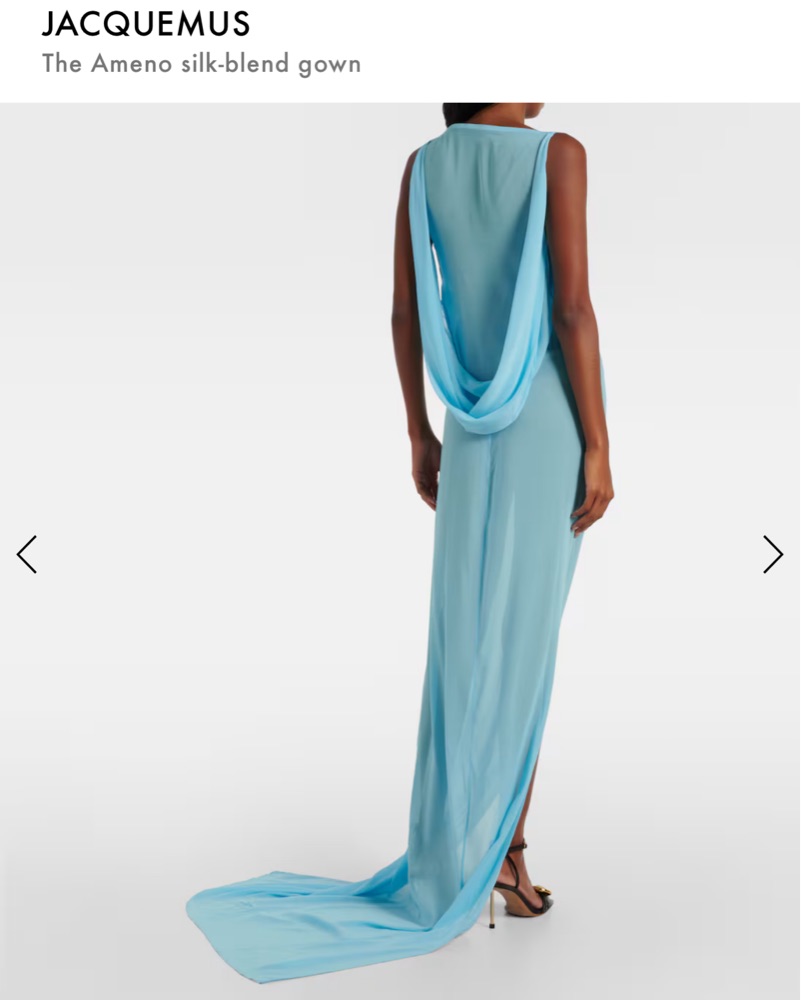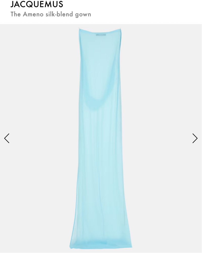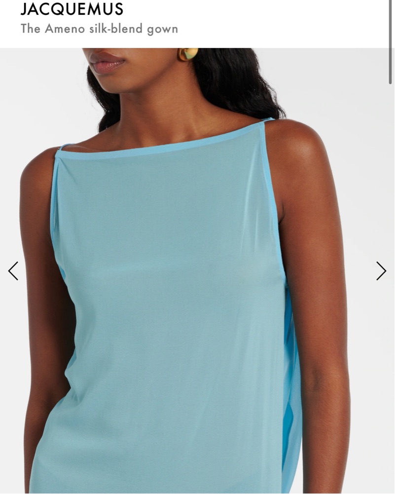 Jacquemus Ameno Blue Silk gown. **sheer** draped blue silk gown perfect for a night out or day at the beach! Model wearing a FR36. Rental for size FR38