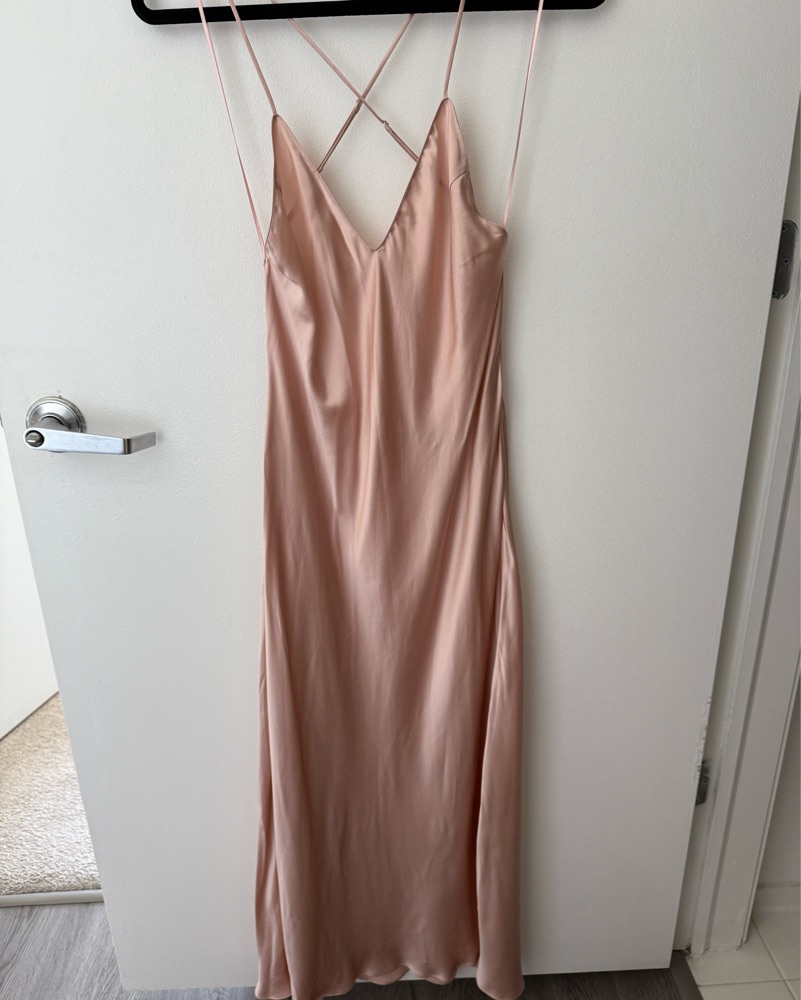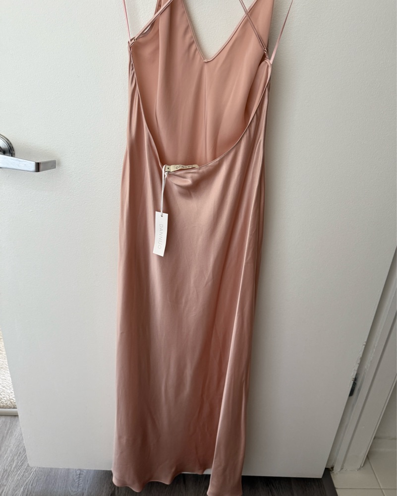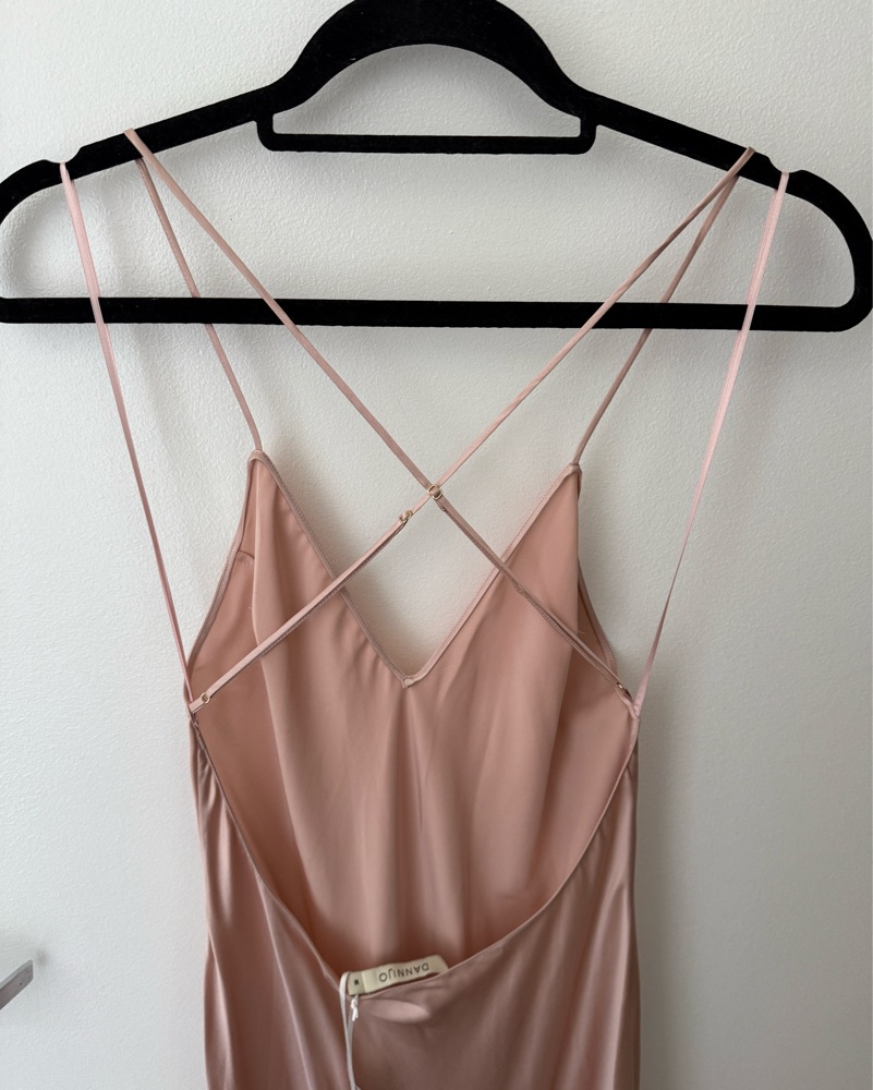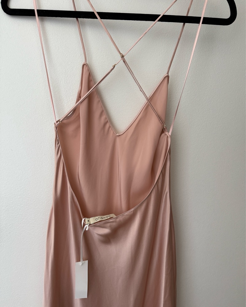 Sophisticated blush satin dress by DANNIJO. Smooth and elegant fabric.