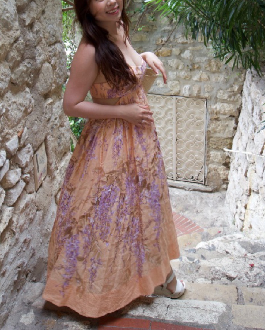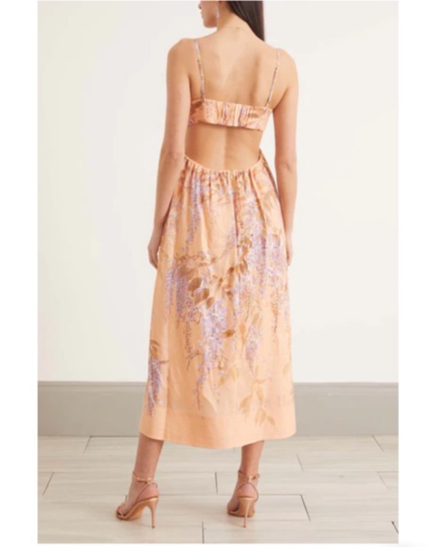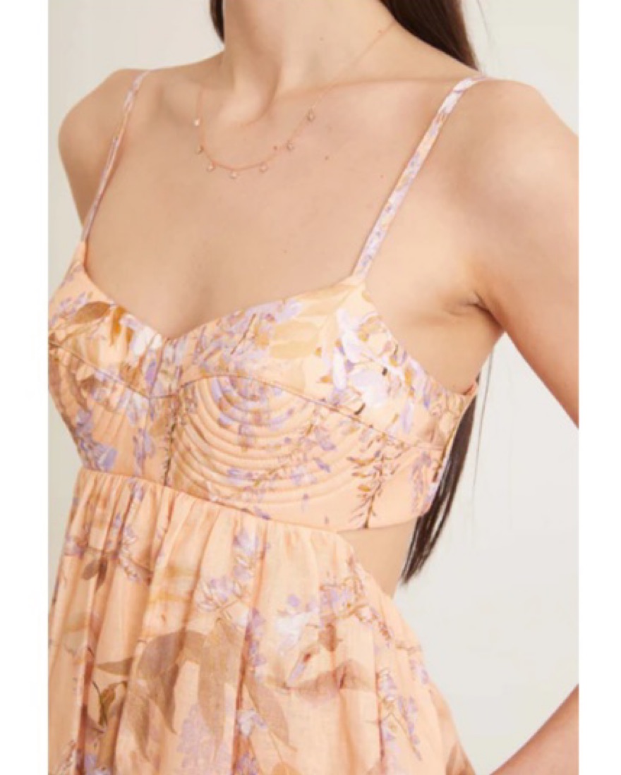 The rosa bralette midi dress in lilac wisteria floral from our resort 2022 collection. A linen midi dress featuring a back cut out, side seam pockets and structured bralette with topstitching and boning in the side seams.