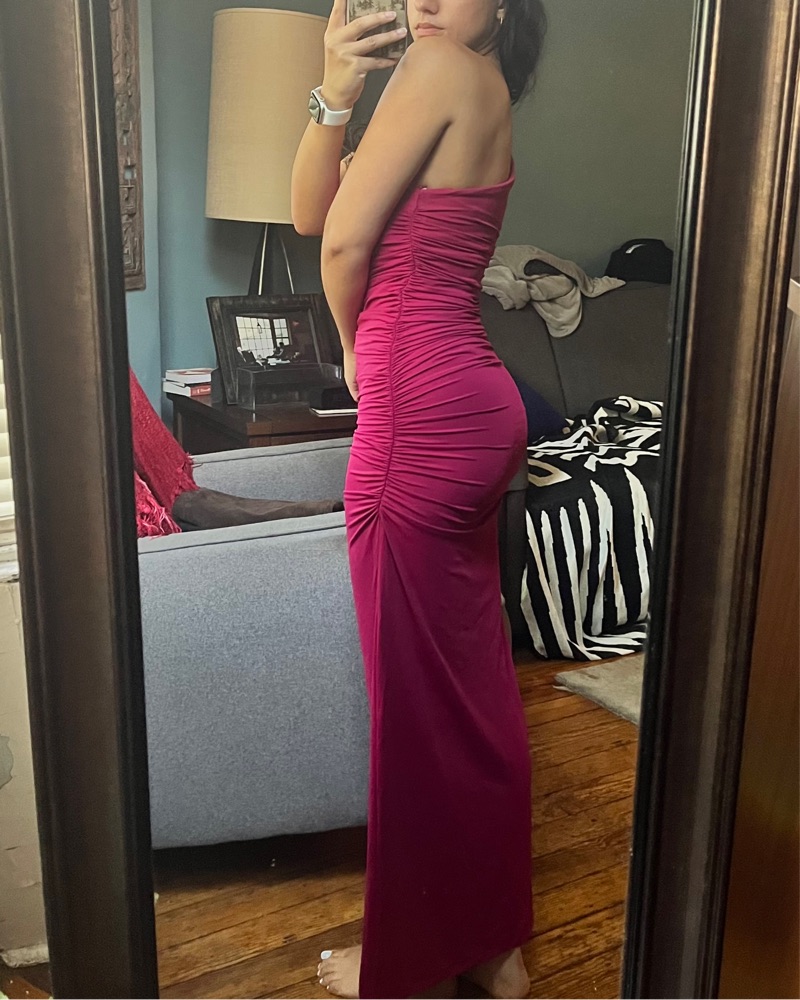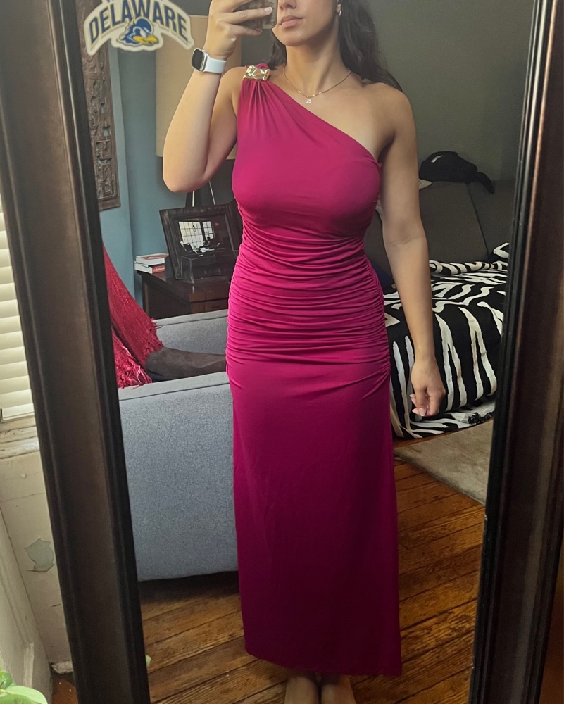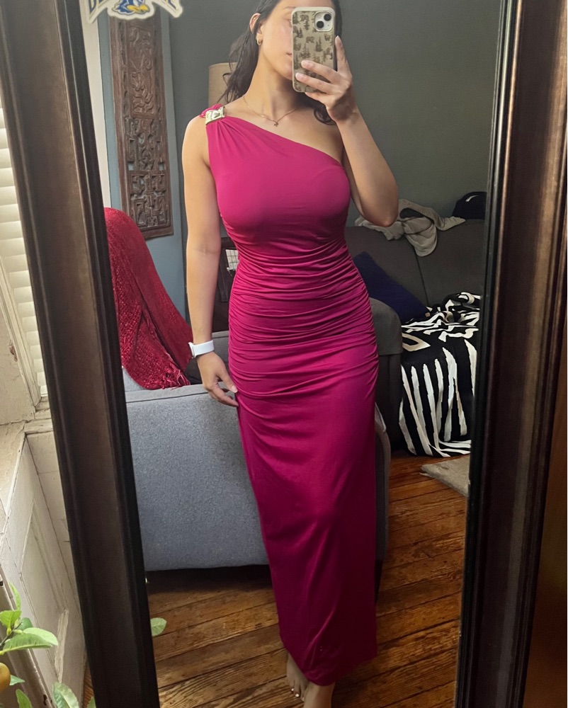 Hot pink maxi dress from Zara with gold detail on shoulder. Perfect for vacation, dinner, or party.