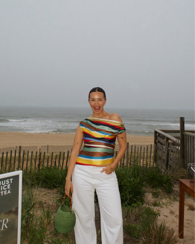 This vibrant, multi-colored striped top is perfect for a fun day at the beach or a casual summer outing. The off-the-shoulder design adds a flirty touch.