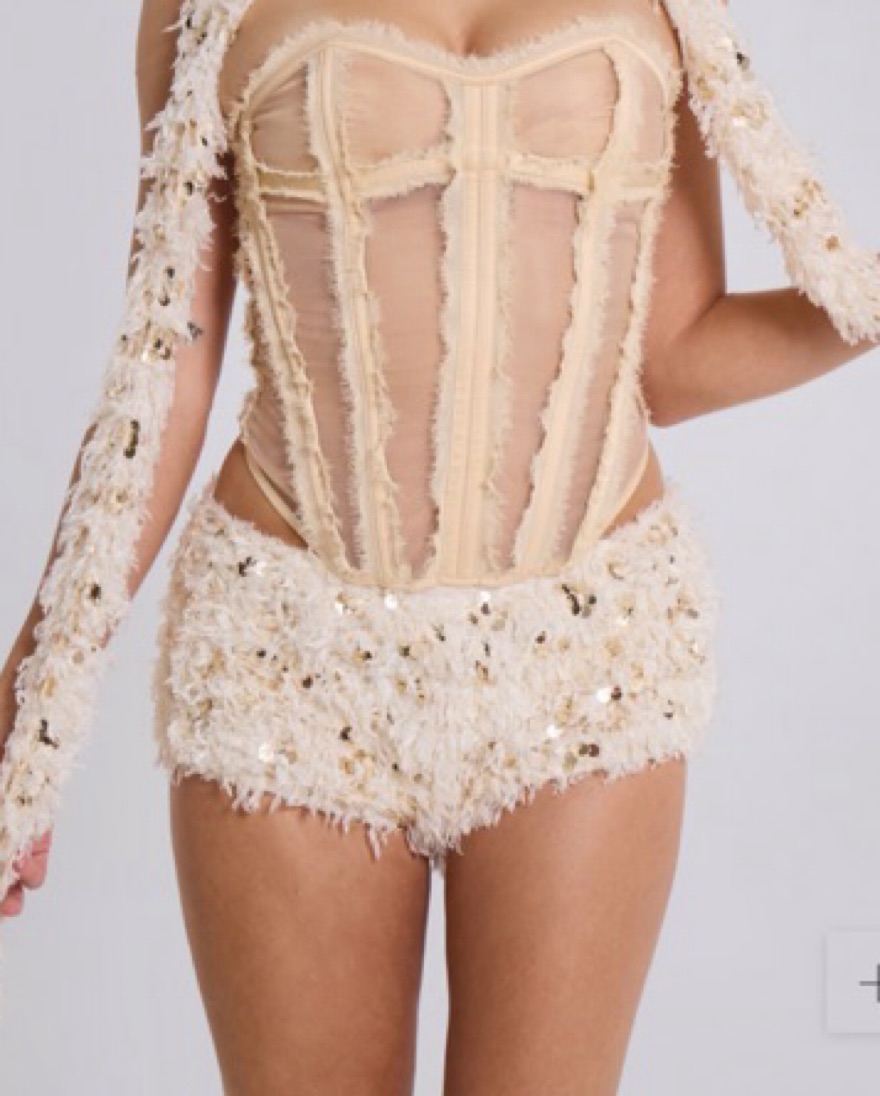 White feather furry sequin micro short. So cute and comfy. Size is UK 6 which is a us 2 but fits an xs/s. I’m more of an XS but they are stretchy.