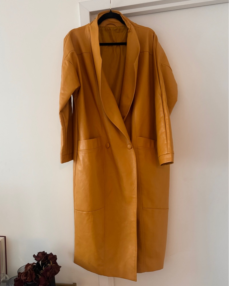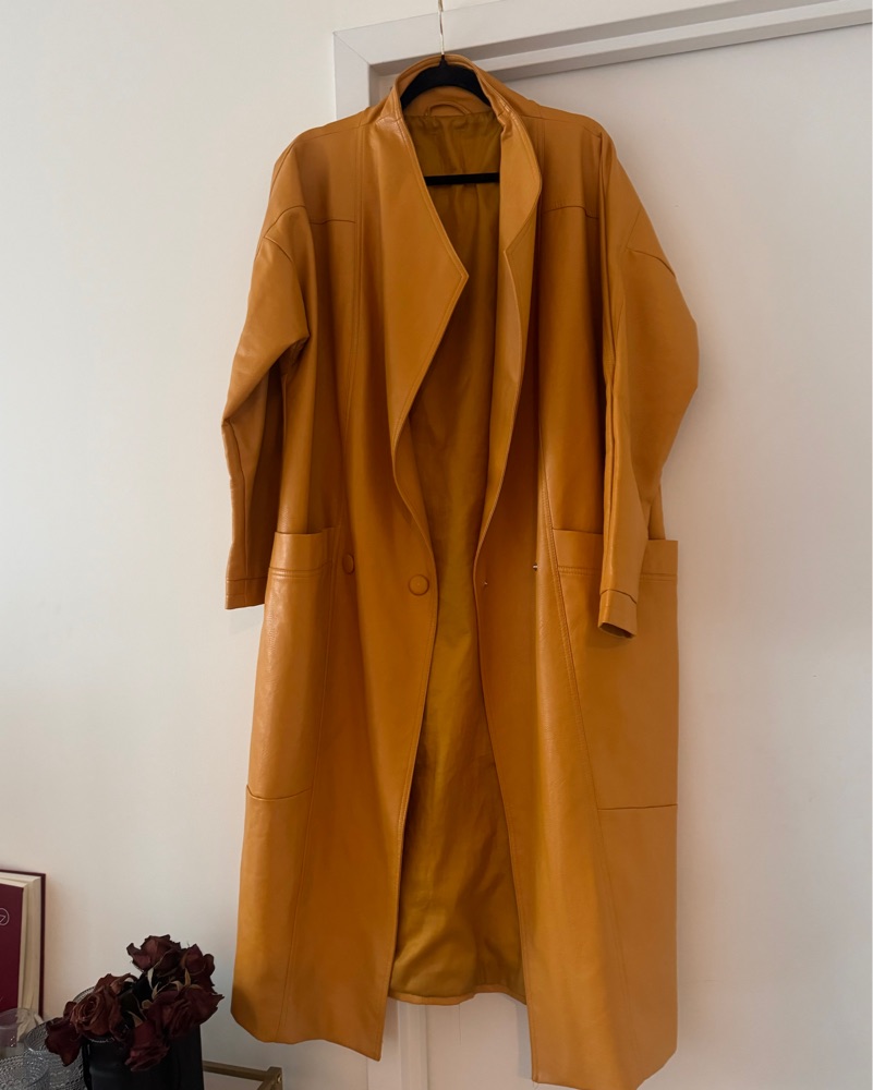 This sleek and stylish mustard yellow longline coat is perfect for dressing up or down. Pair it with your favorite jeans and sneakers for a casual weekend look, or elevate it with a midi dress and heels for a night out.