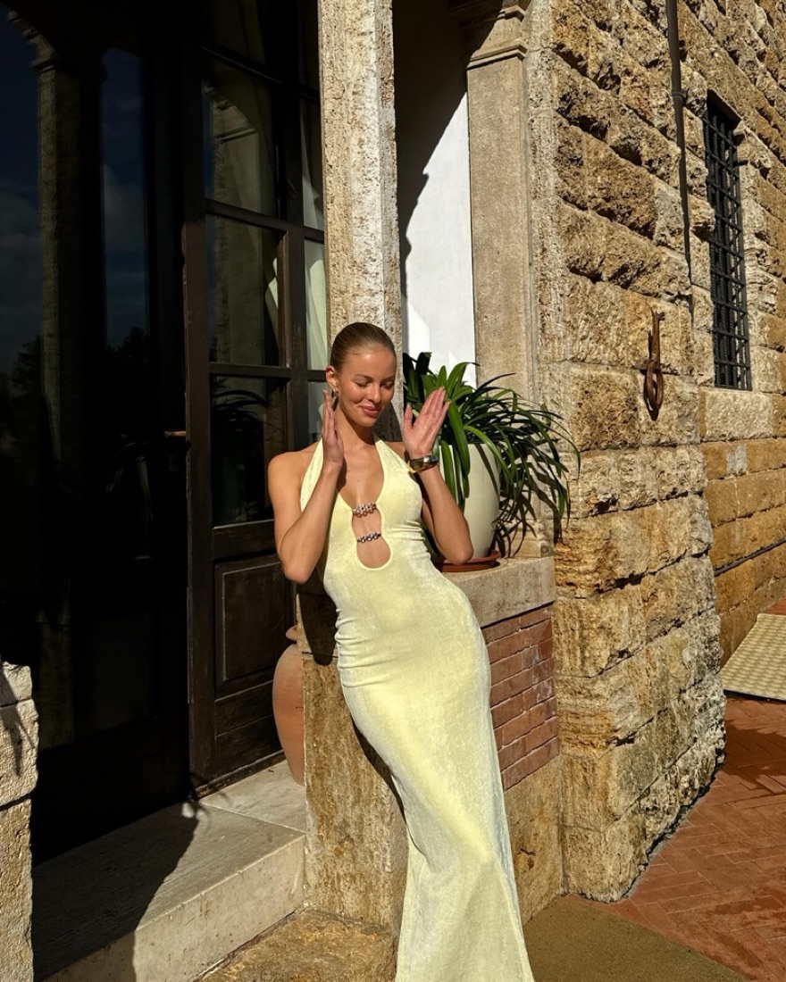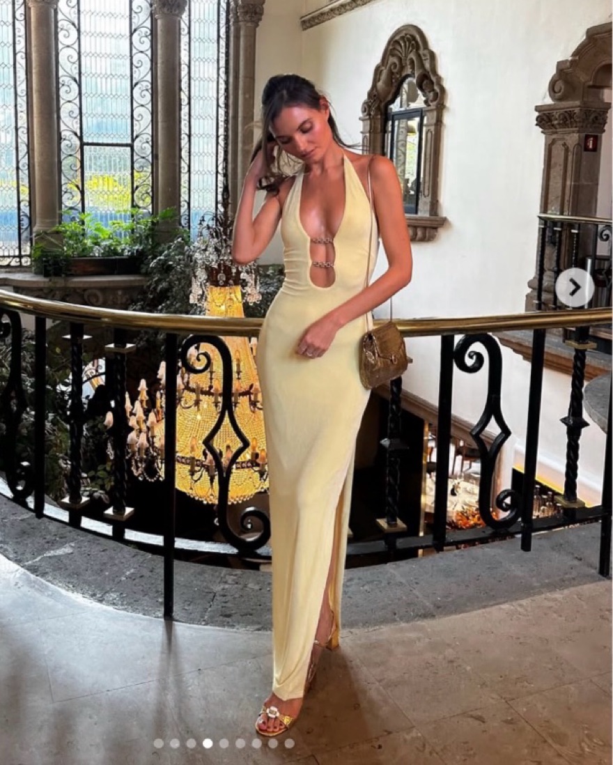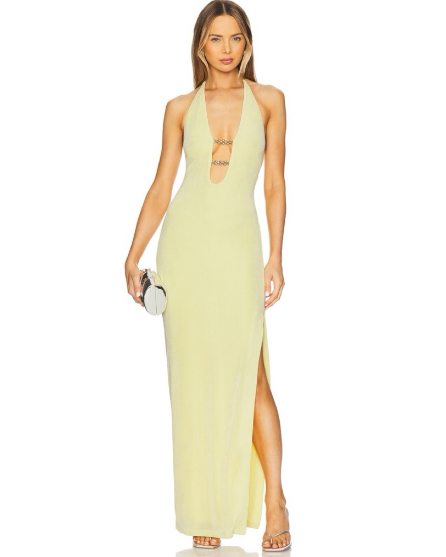 New season! Size small. Model is 5'10" and is wearing this size. True to size. Fully lined, body con silhouette. Shoulder seam to hem measures approx 60" Tags: yellow dress, butter yellow dress, misha dress, going out, birthday dress, tequila sunrise dress, cult Gaia