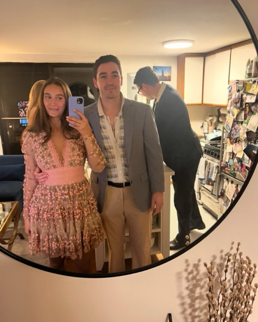 This stunning floral mini dress features a plunging neckline and long sleeves, perfect for a night out or special occasion.