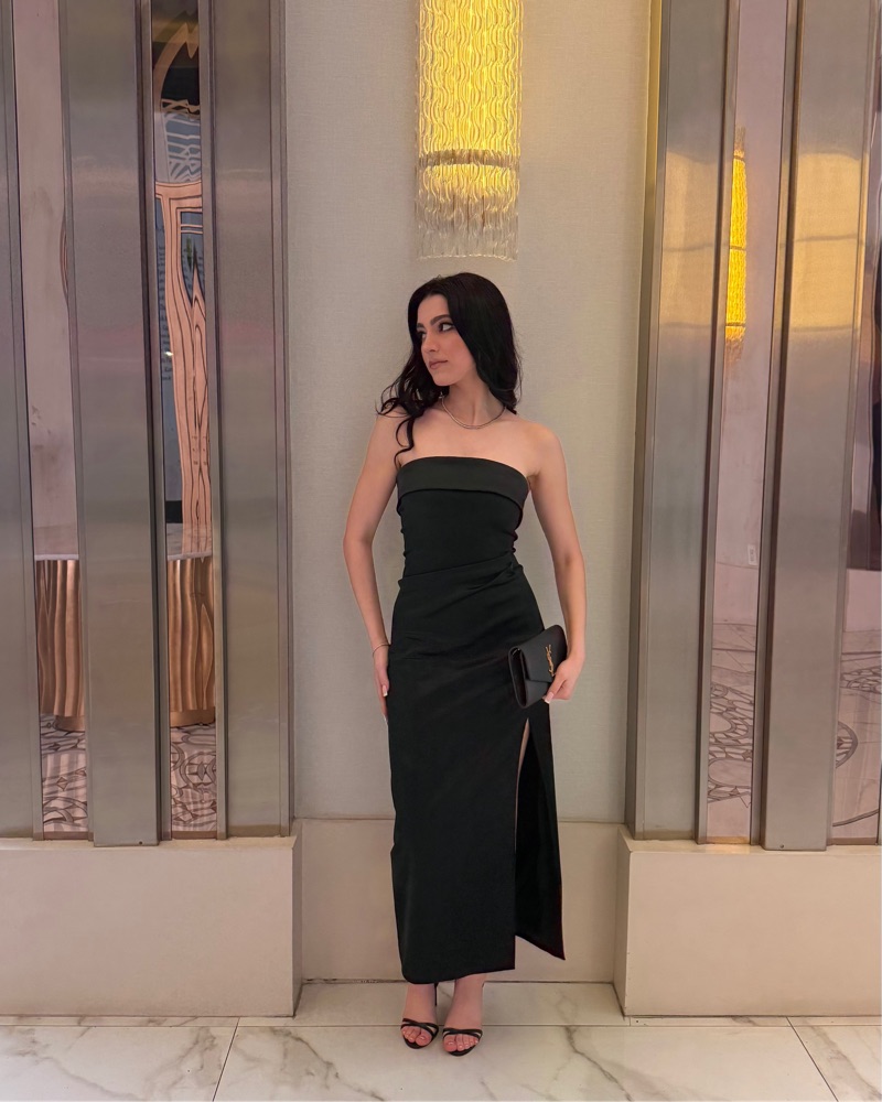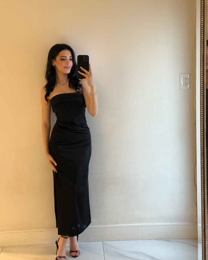 This sleek, strapless black gown is perfect for a formal event or special occasion. The figure-flattering silhouette and high slit create an elegant, sophisticated look.