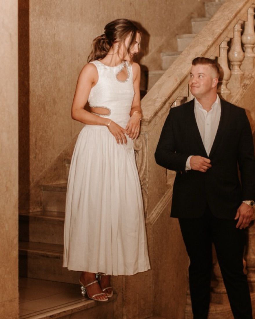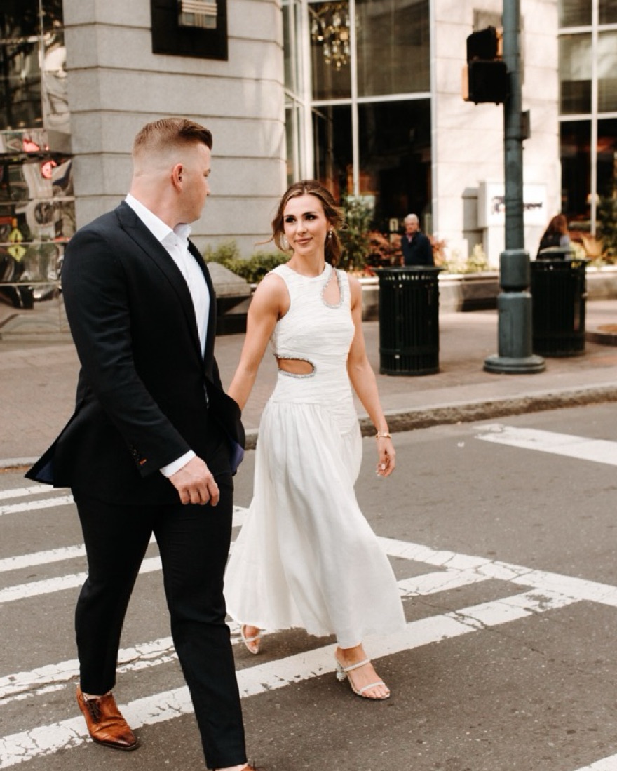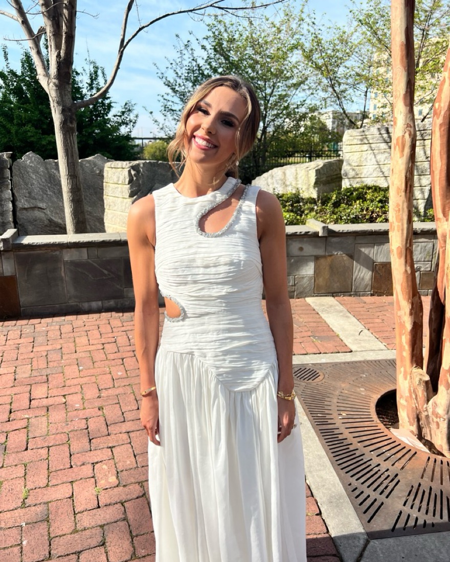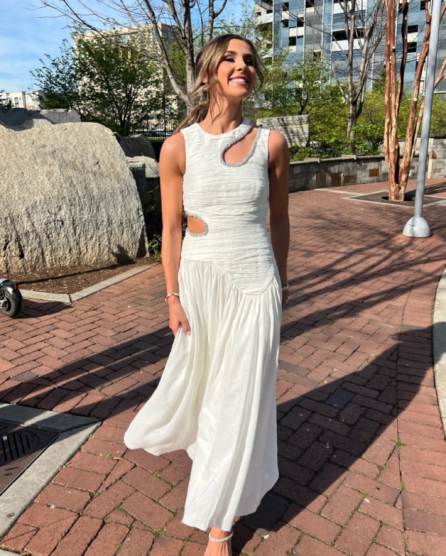 This beautiful white maxi dress is perfect for a formal event or special occasion. The flowing, ruched fabric and cutout detailing create a sophisticated yet stylish look. small spray tan stain around arms. Not noticeable when wearing. Runs slightly small.