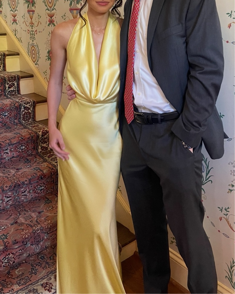 Sau Lee halter gown in butter yellow hue. Wore it once for a wedding and is in perfect condition. I’m 5’6” and I got it hemmed to wear with 3-4 inch heels. Material is a buttery satin fabric