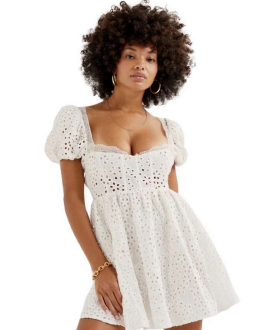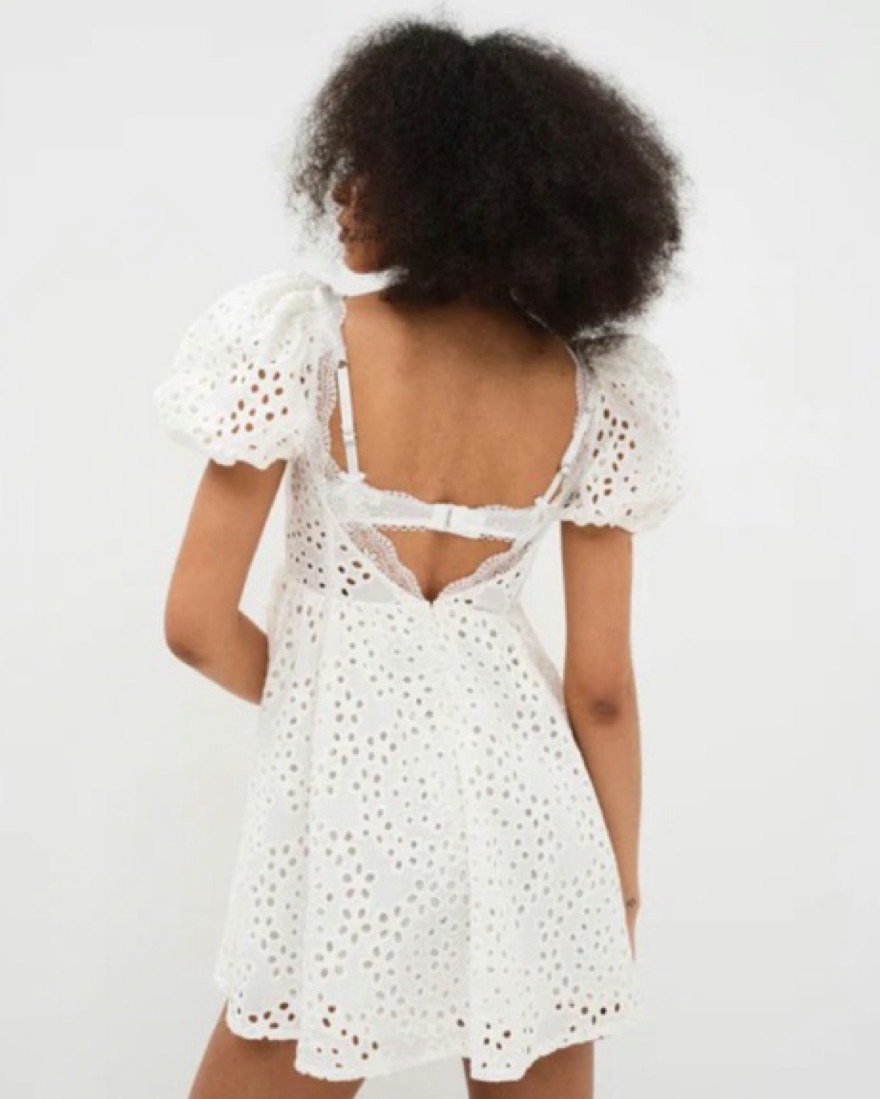 Dreamy linen mini dress featuring eyelet embroidery and a corset that overlays a built-in peekaboo lace bra. Puff sleeves, plunging open back with an adjustable hook & eye closure.