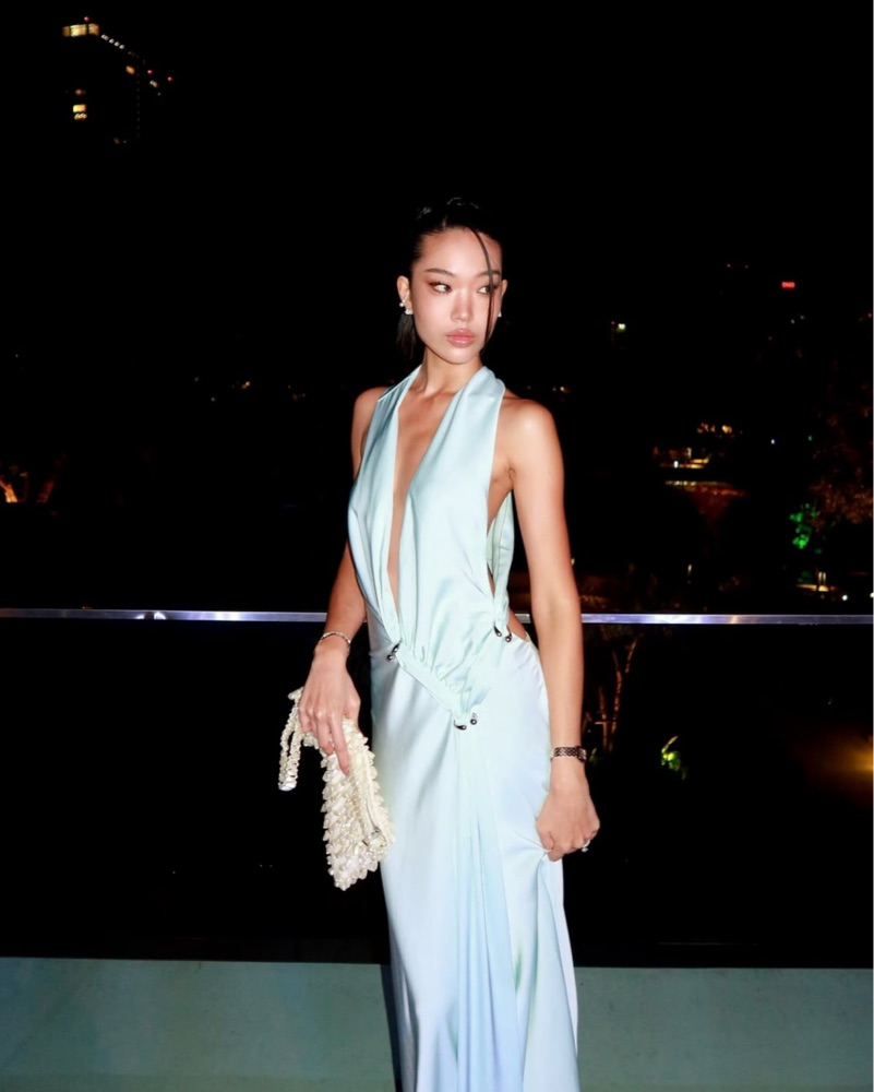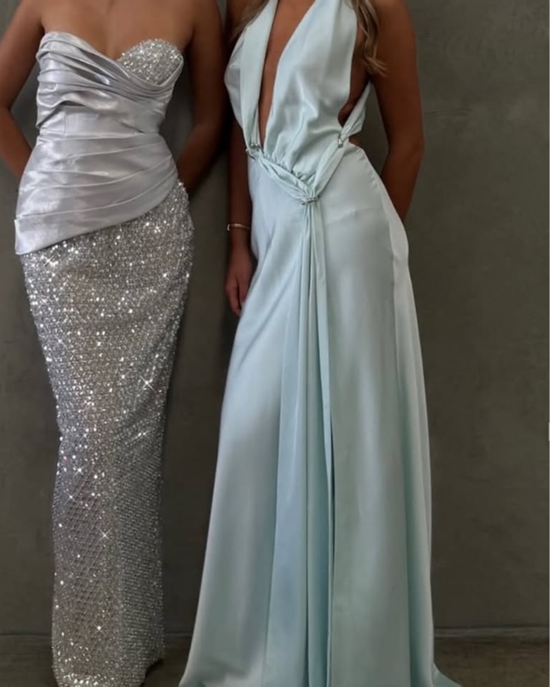 Gorggggeous event dress, perfect for a gala or wedding guest 🩵 Finished with three rings on the hip, fixing two waterfall sashes that cascade down the garment. Featuring an asymmetric back and plunge neckline.