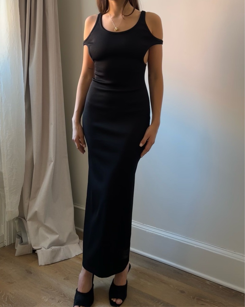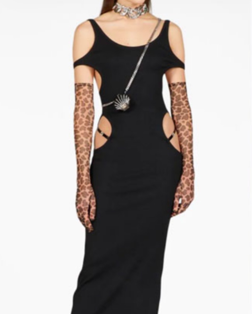 This unique black cotton-silk fine knit stretch dress is the commercial version from the S/S 22 show. Very chic cut-out detail on the shoulders and a crystal embellished G plaque on the back. Very flattering and comfortable.
