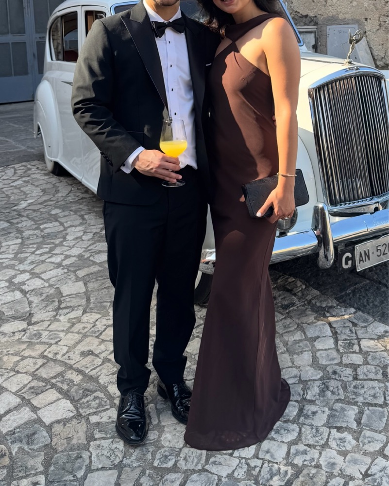 Brown floor length halter gown in a chiffon fabric. Only worn once for a wedding reception, in perfect condition. I’m 5’7” and was able to wear it with a 2 3/4 inch heel.