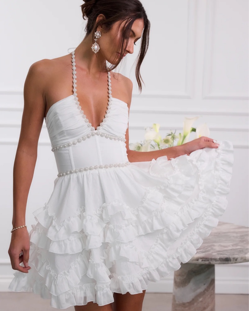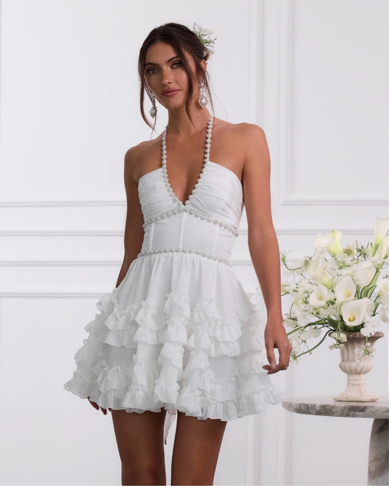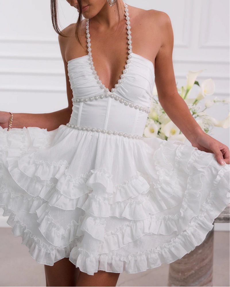 Meet Sophie! She is a gorgeous halter mini dress embellished with delicate pearl and crystal beaded trim. She features a stunning corset bodice, beautifully gathered skirt with zigzag and straight rows of delicate ruffle details, and an invisible zipper.