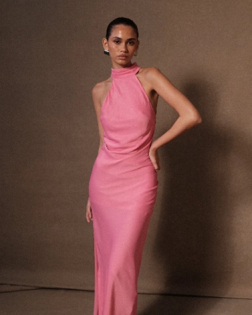Meshki Claire dress in pink. Satin drape back maxi dress with split. Size small. Get so many compliments on this dress and the back is gorgeous!