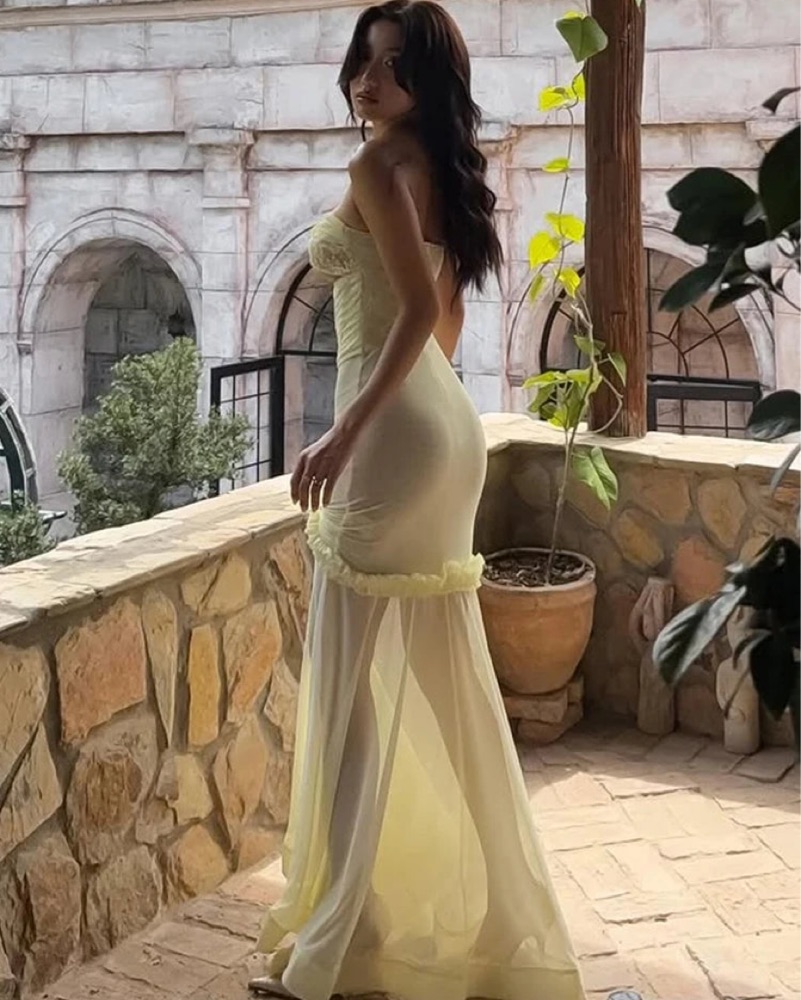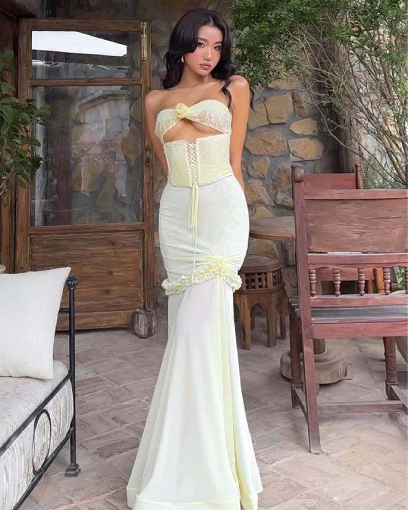 . Bandeau bra with attached handmade flower at front, hook-and-eye closure at back