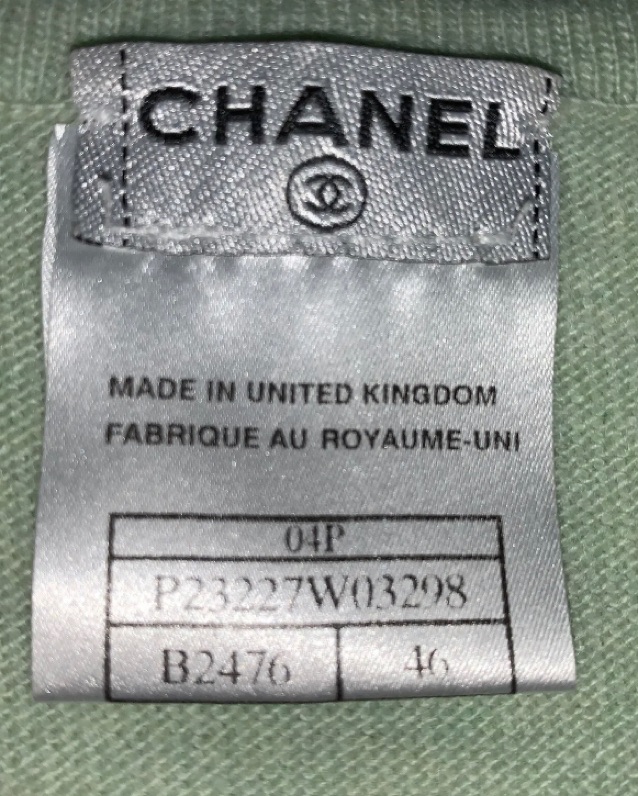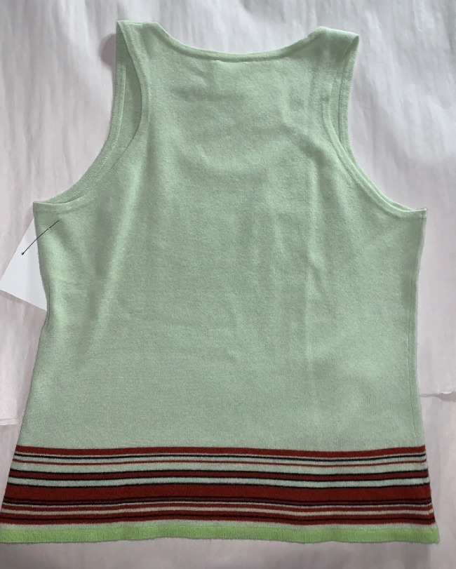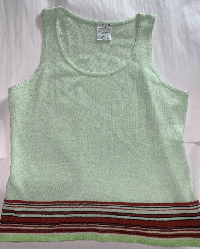 VINTAGE authentic CHANEL size 46 green m cashmere tank top blouse with striped detail at waist. VERY GOOD VINTAGE CONDITION one small pin hole at chest, see photo. From Spring/Summer 2004 Collection. Red enameled CC logo at bottom hem.