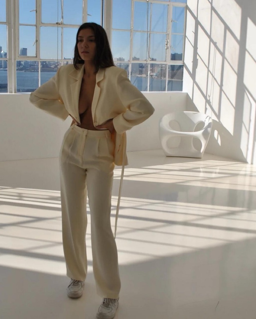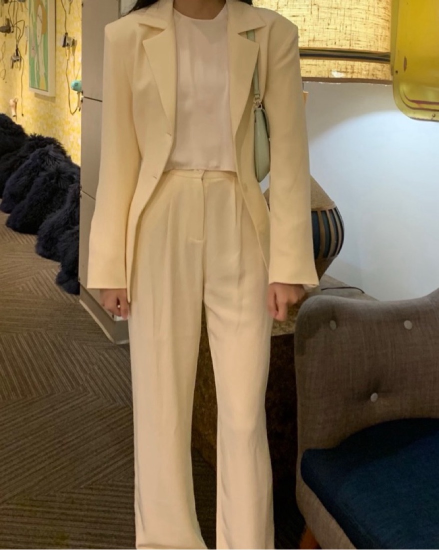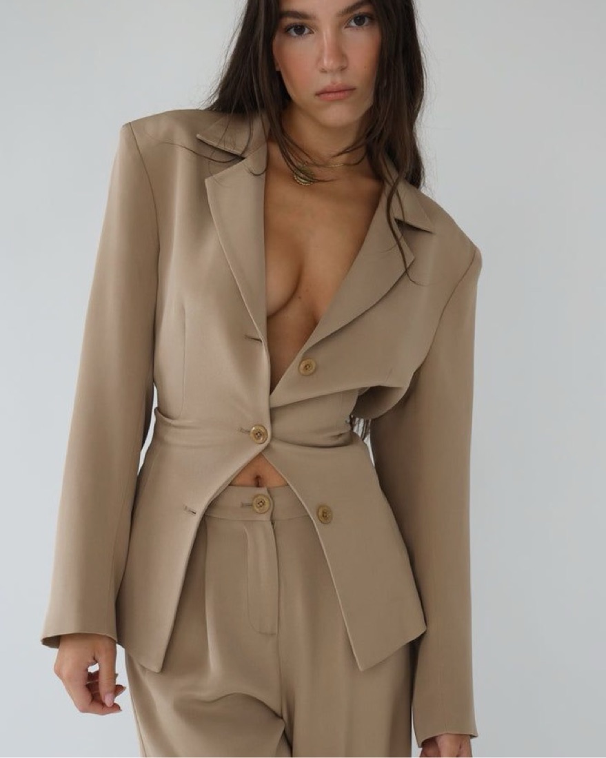 Blazer size M/L fits small! 4-8. Pants size L but fit SMALL. More like a 4 low rise, 6 mid rise, and 8 high rise. The color is tan. The two last photos and yellow are just to show how to style the set.