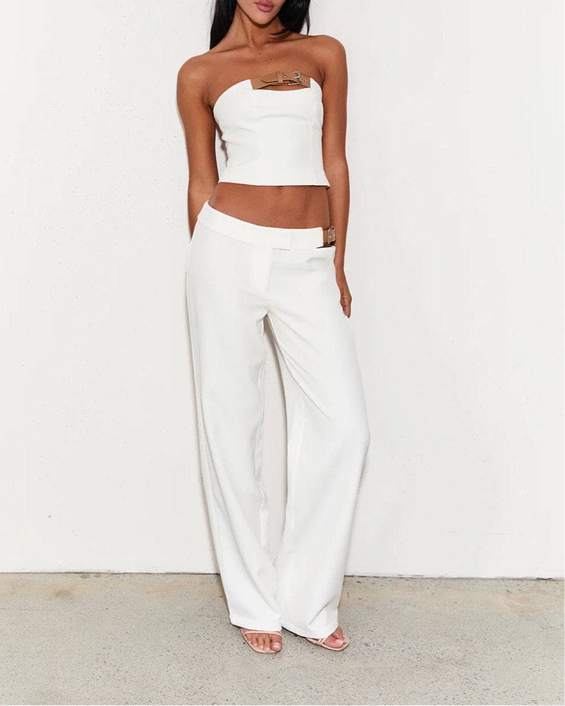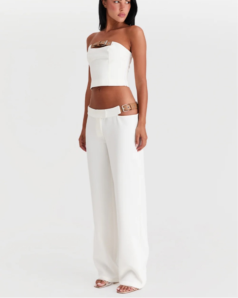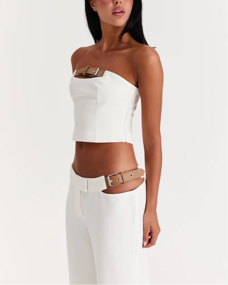 Cute white set with belt buckle detailing. Belt buckle is adjustable! Perfect for brides, the Hamptons, & euro summer