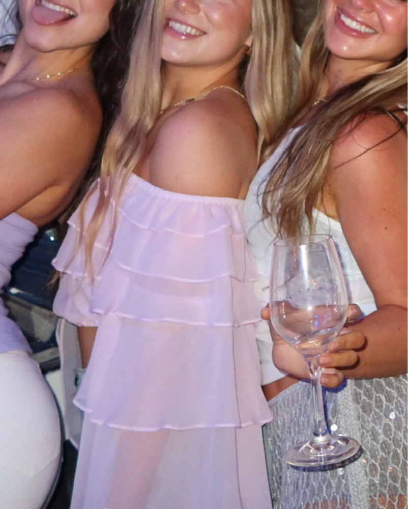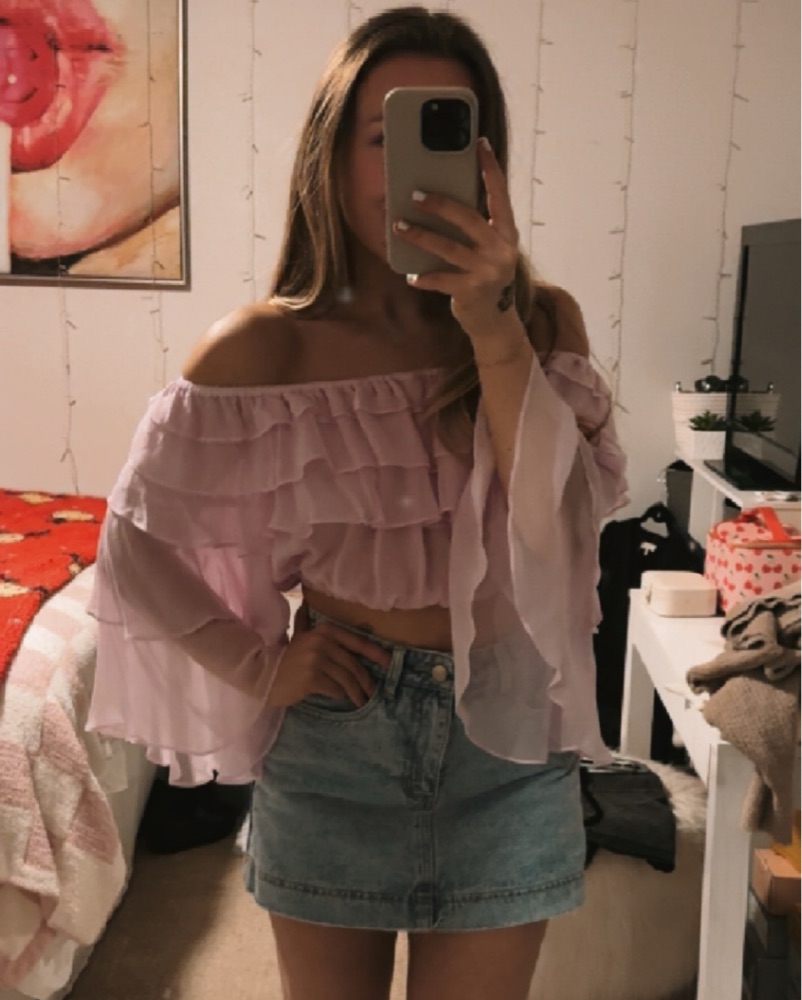 I love this girly frilly top! It’s adorable! I wear a strapless bra with it because it’s a little sheer but not super see through. In perfect condition. Only wore it a couple times.