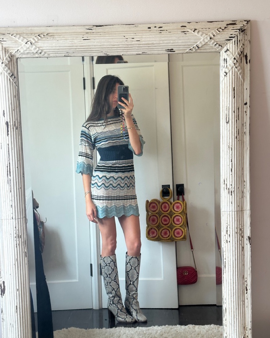 This is a mini knit Missoni dress. With mid length sleeves and a boat neckline, it’s perfect for all seasons. The synched waist detail is 10/10!!!