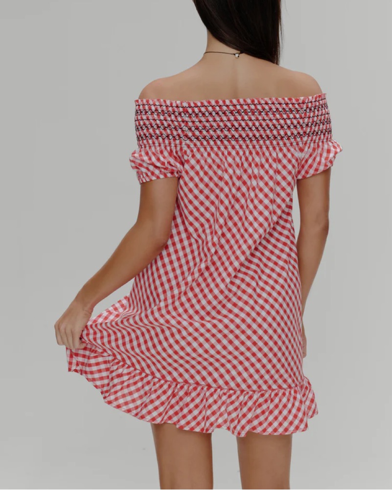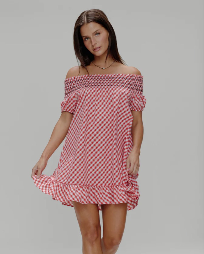 New drop, Frankie’s bikinis ruby gingham babydoll mini dress