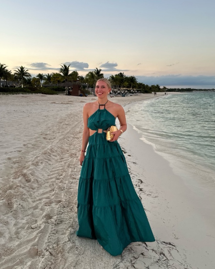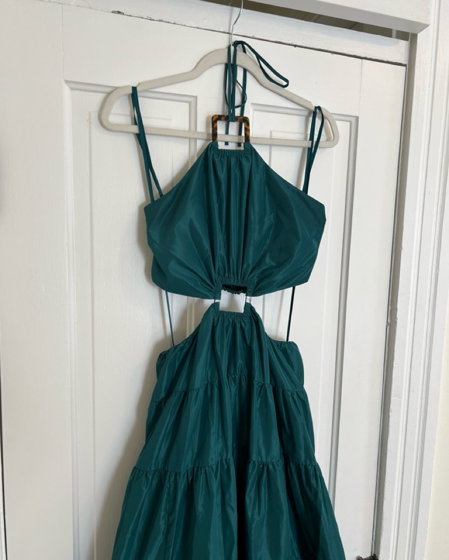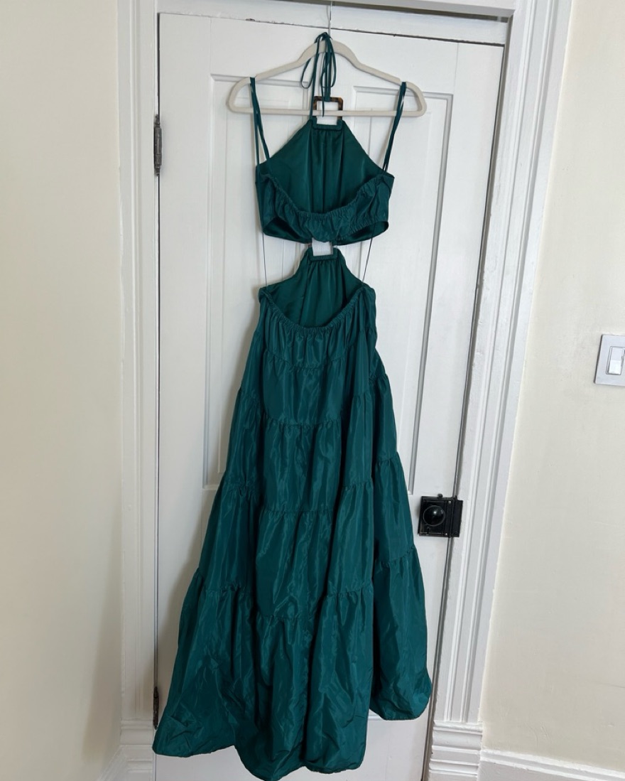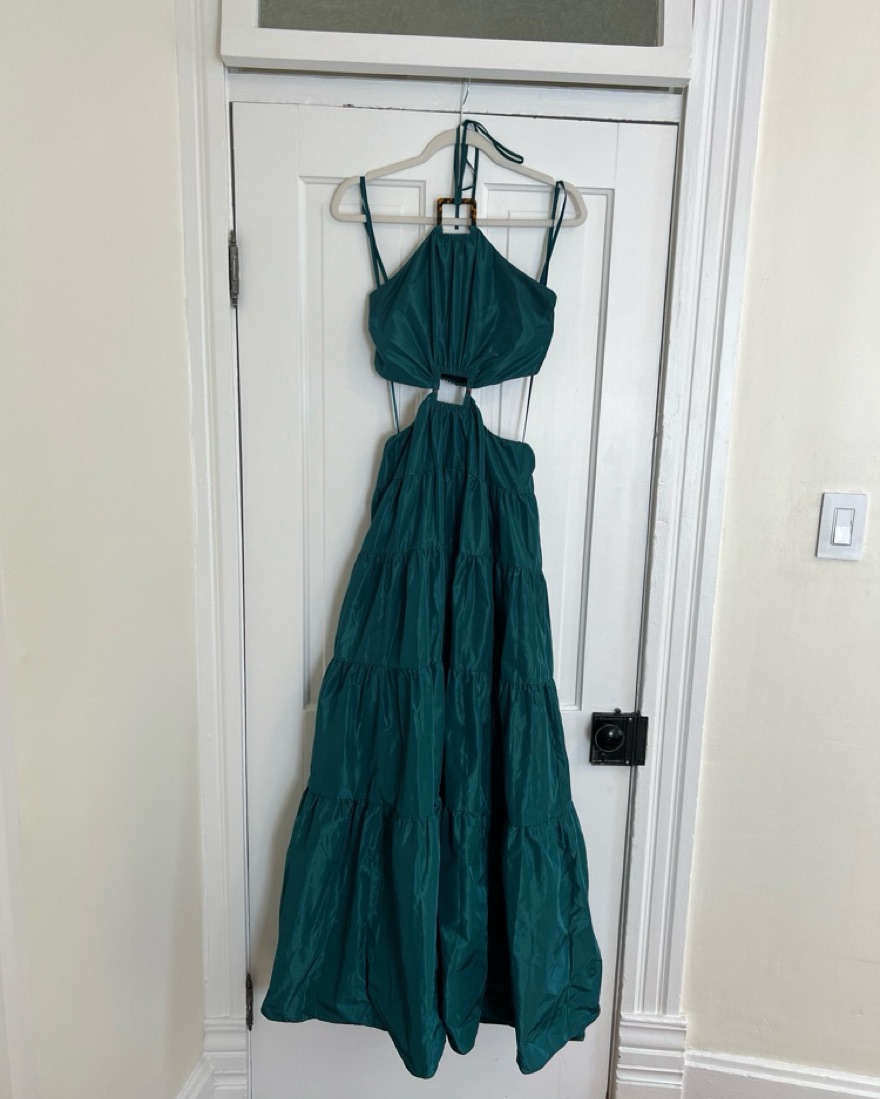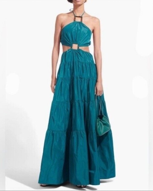 Staud gown / maxi dress with high neck and semi-open back! Back is elastic which makes for an easy fit. I am 5’7” and wore this with no shoes and it touched the ground for me. Perfect for a summer wedding or beach vacation.