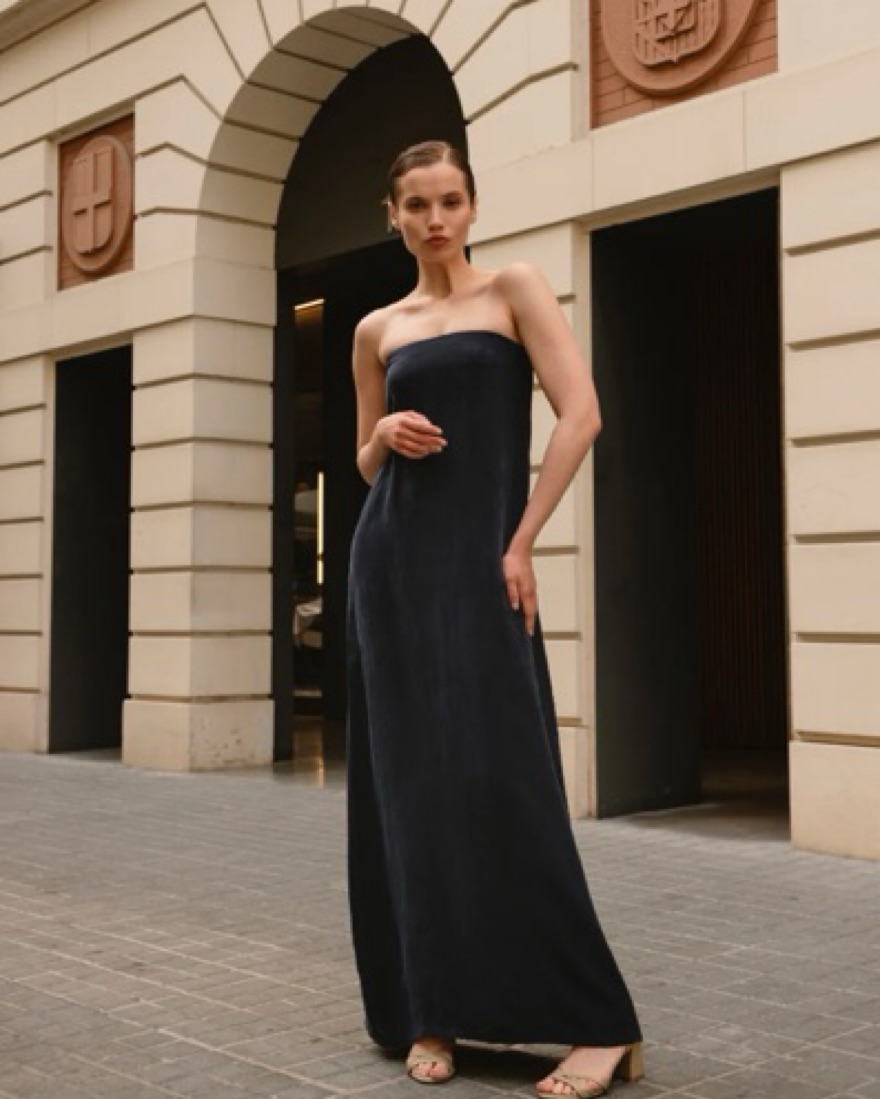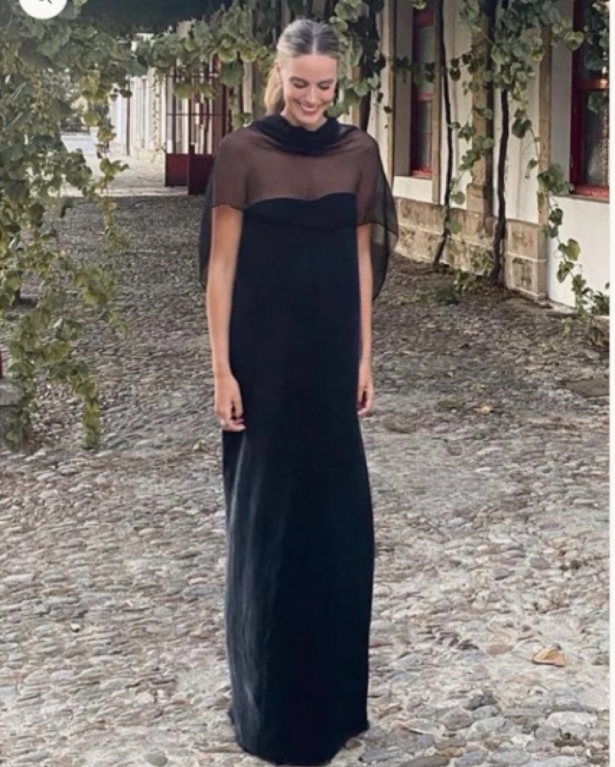 Cris Serra strapless dress in Azul Noche. Worn once! Strapless dress held by an inner elastic at the top. It has an invisible zipper and inner lining. The cape can be worn as a scarf. Fits like a size 2 or 4, but was made to order as follows: bust 33.5”, waist 26”, hips 35”, length 54.5”
