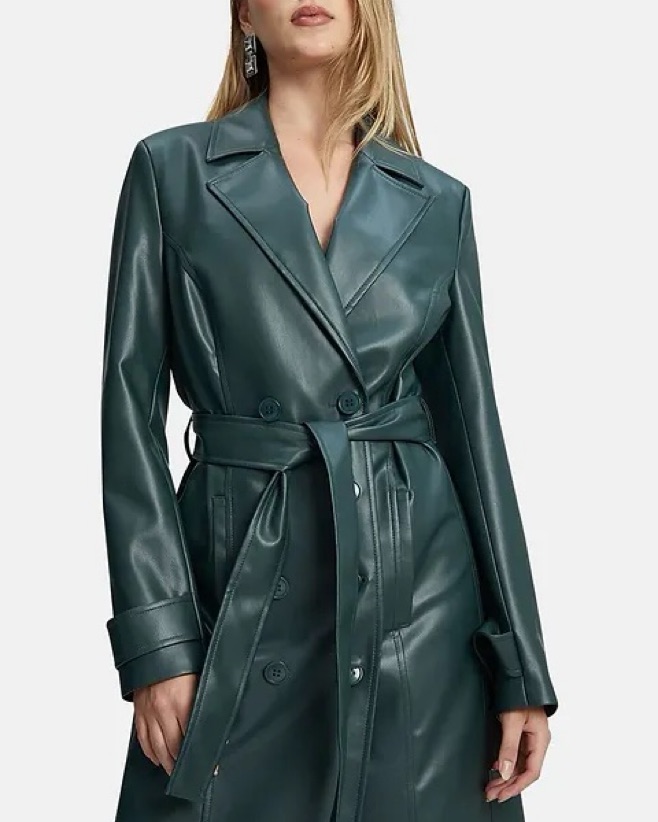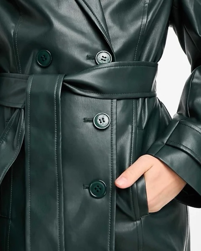 Fits sizes XS/S or 0-4/6. Dual-breasted front button closure with button cuffs. Detachable faux leather waist tie. Side seam pockets. Faux leather fabric with back vent. Evergreen color. NWT, never worn.