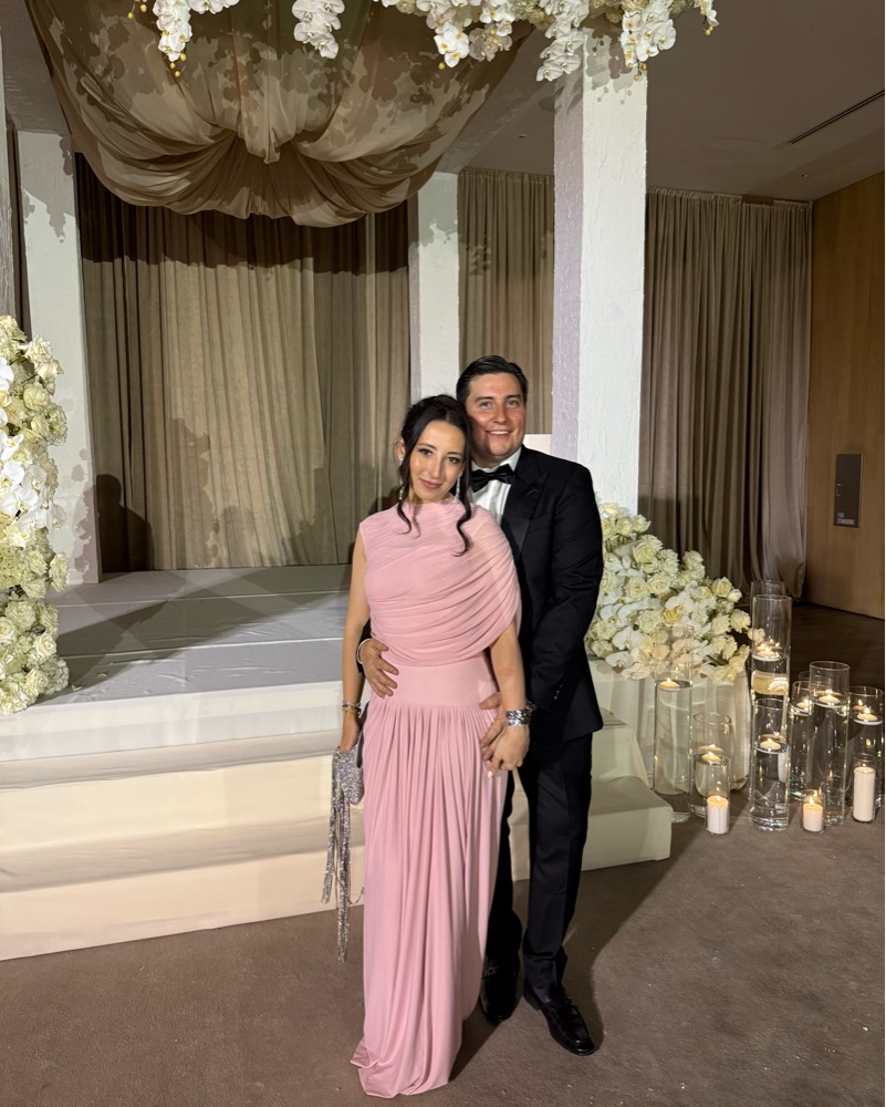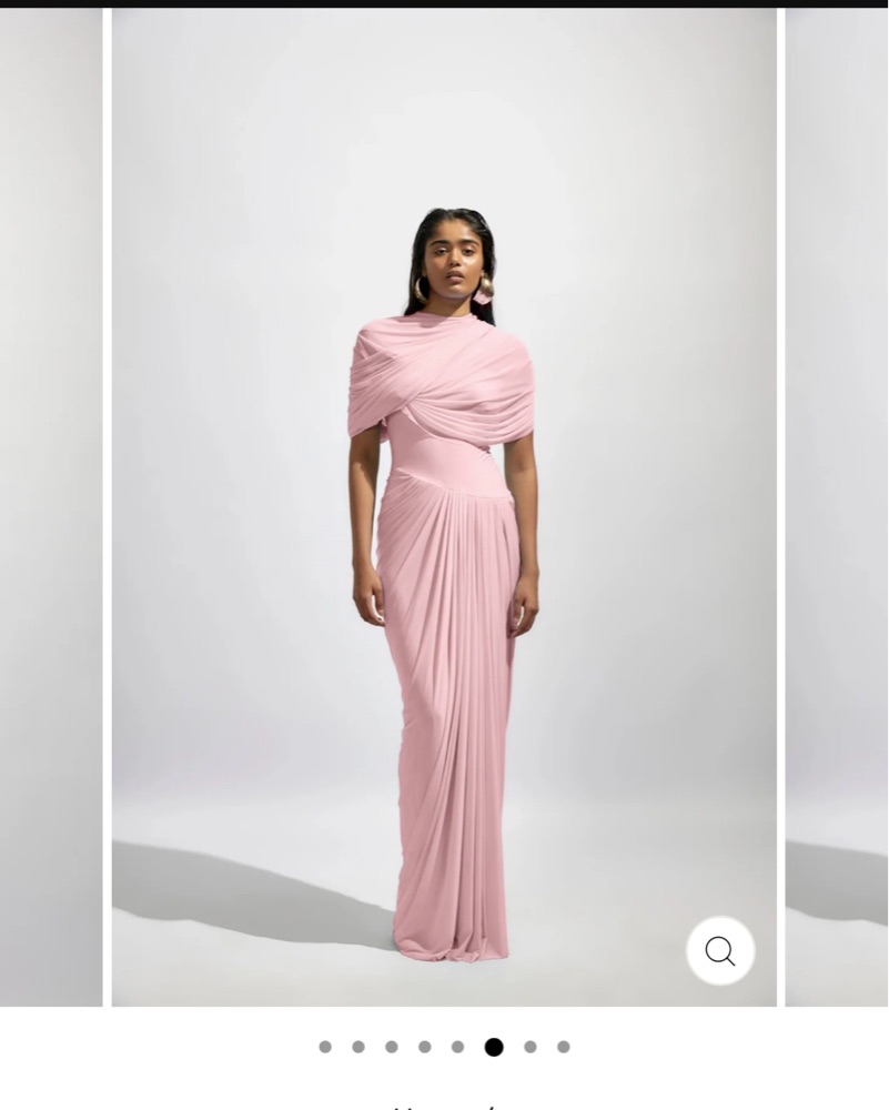 Dress is pictured in pink. Worn once then dry cleaned. Extremely flattering. Elegant shoulder draping.