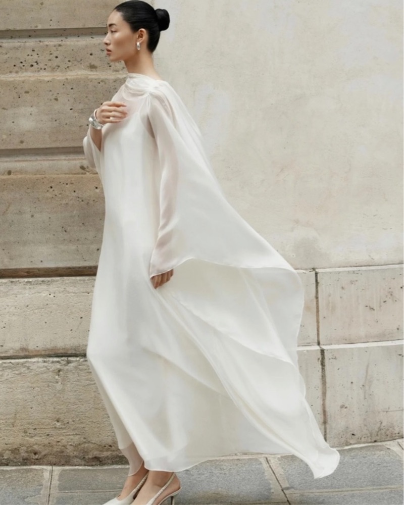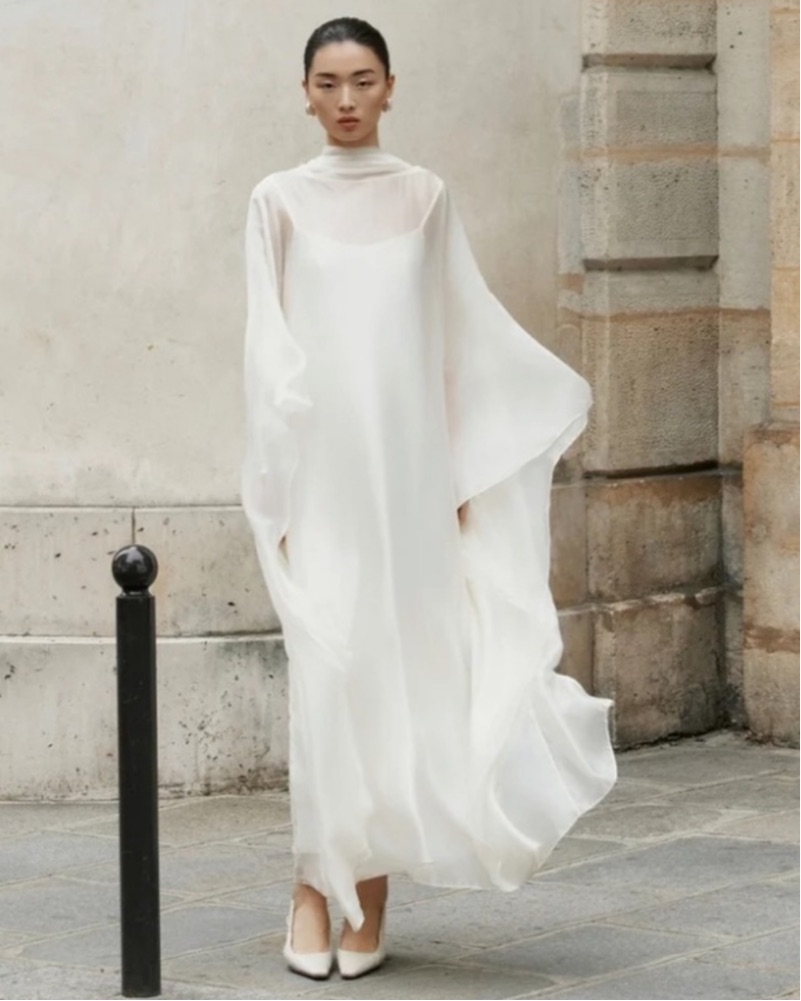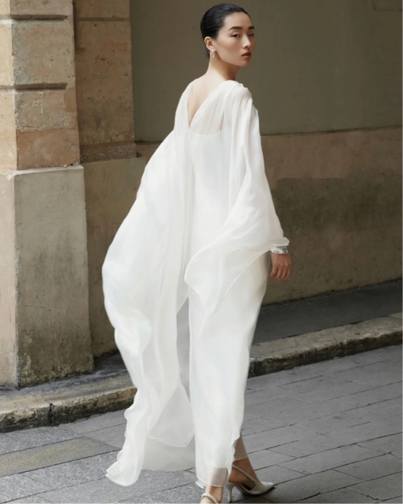 From Huong Boutique. Perfect for a bride! It is a white slip with a chiffon cape. I’m 5’3 and the dress hits past my ankle.
