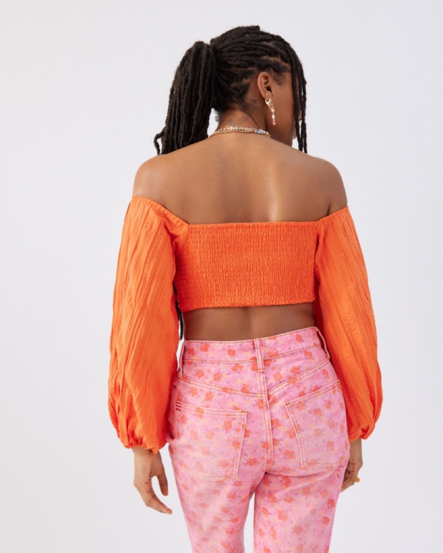 Off-the-shoulder top from UO with puffy long sleeves. Cropped above the waist with a subtle v-neckline and a cinched detail at the bust. Finished with an adjustable tie at the hem. Only worn once!
