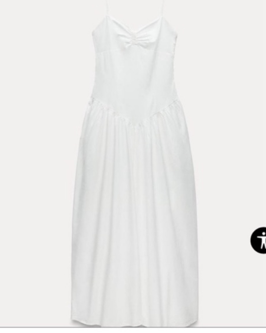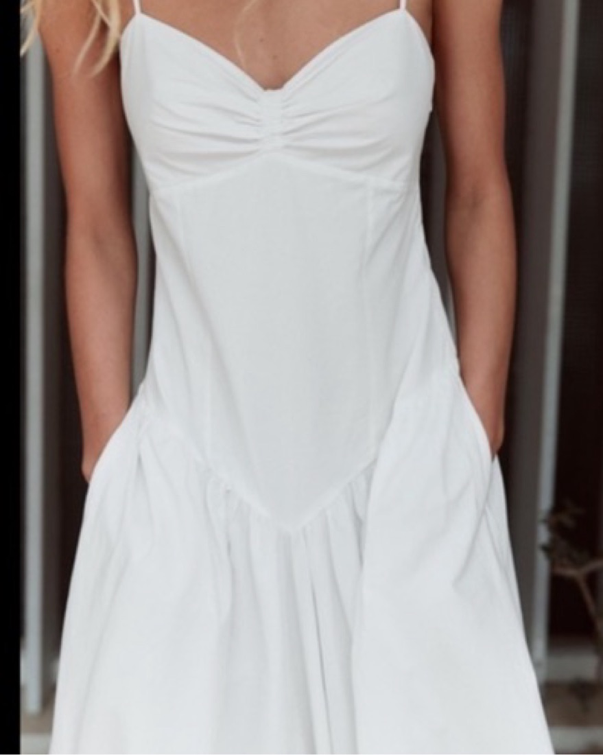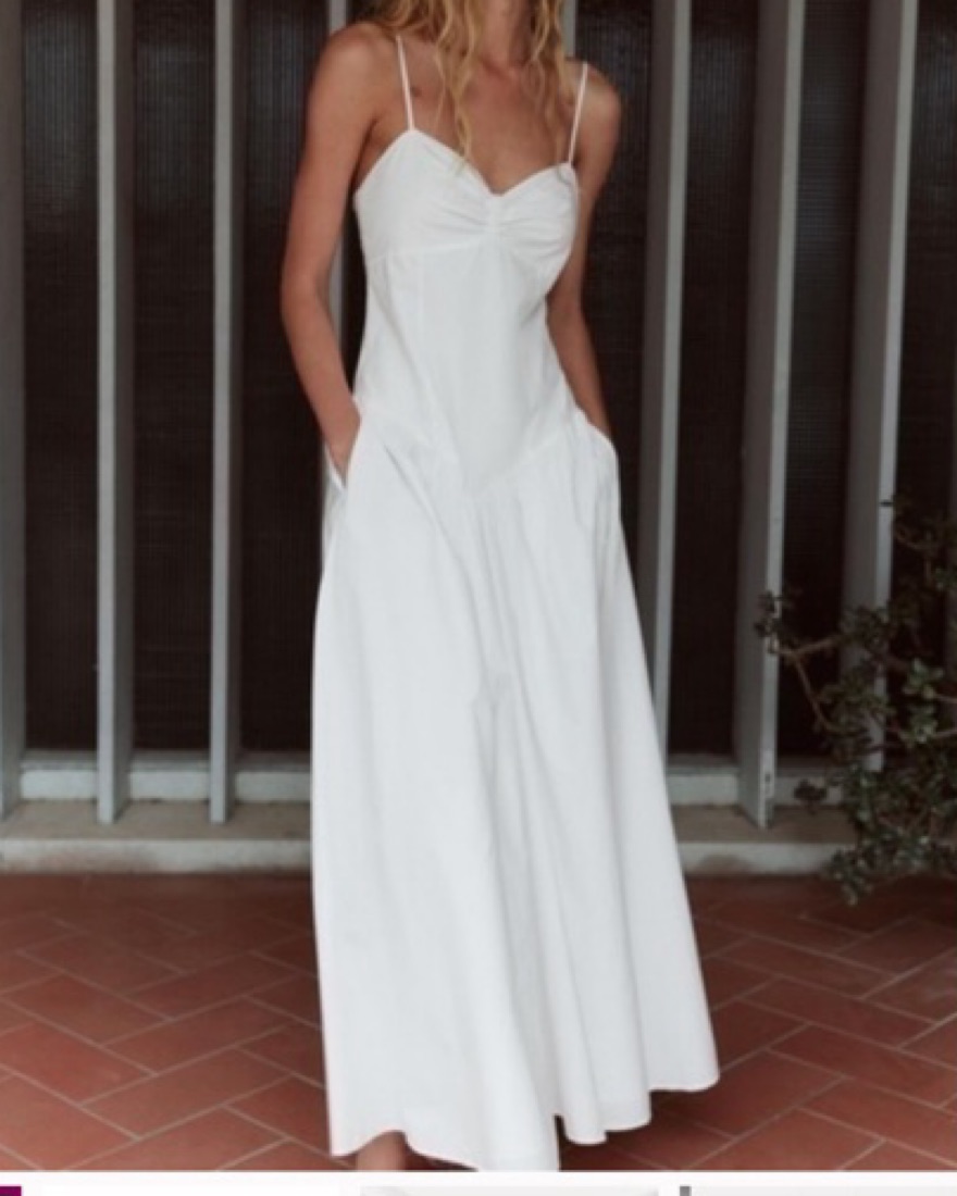 This stunning white maxi dress with a ruched bodice and flowing skirt is perfect for a formal event or wedding.