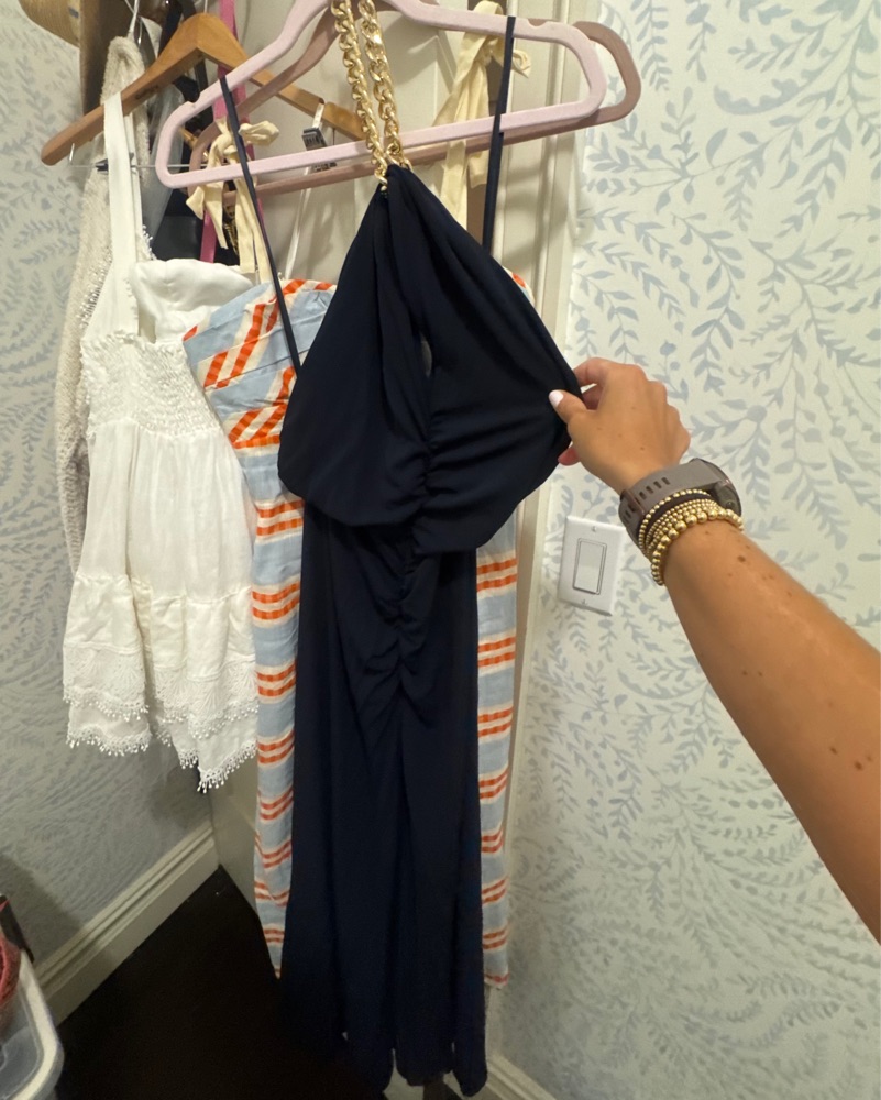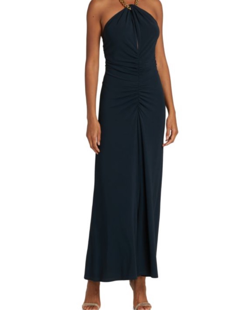 The Reze dress from Veronica Beard is a ruched style with a chunky chain-link halterneck in navy blue size XS.