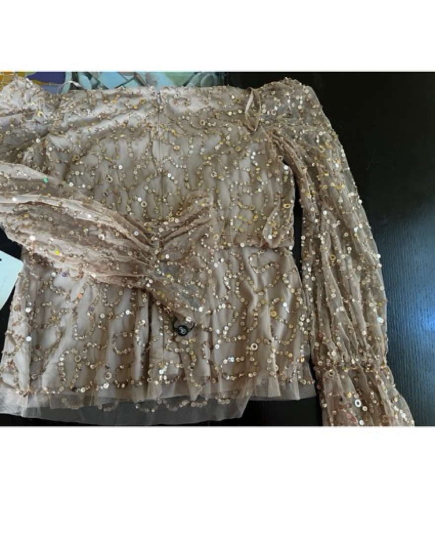 Gold sequence top that is off the shoulder long sleeves, very elegant