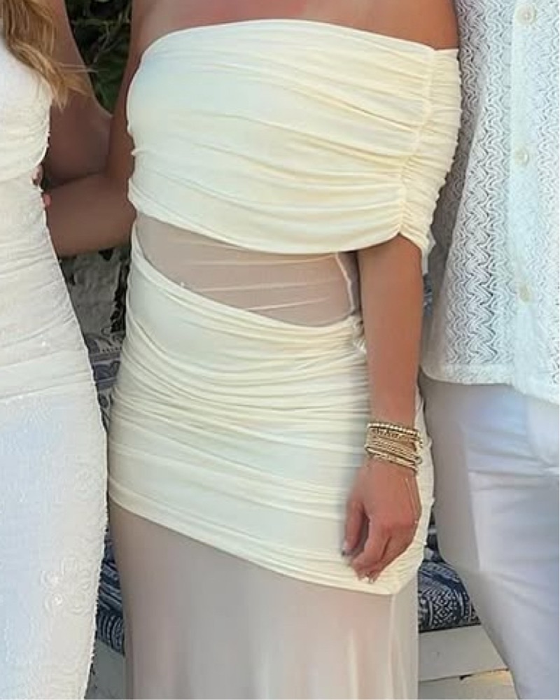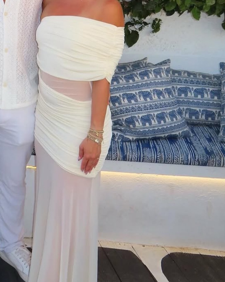 This stunning off-the-shoulder maxi dress is perfect for a formal event or special occasion. The ruched detailing and flowing silhouette create a flattering and elegant look.