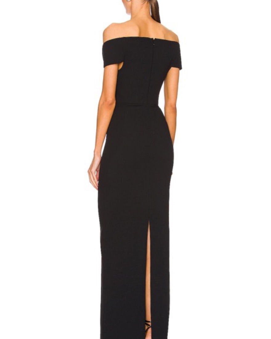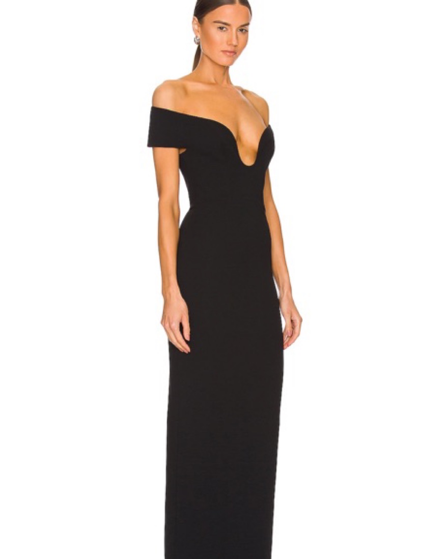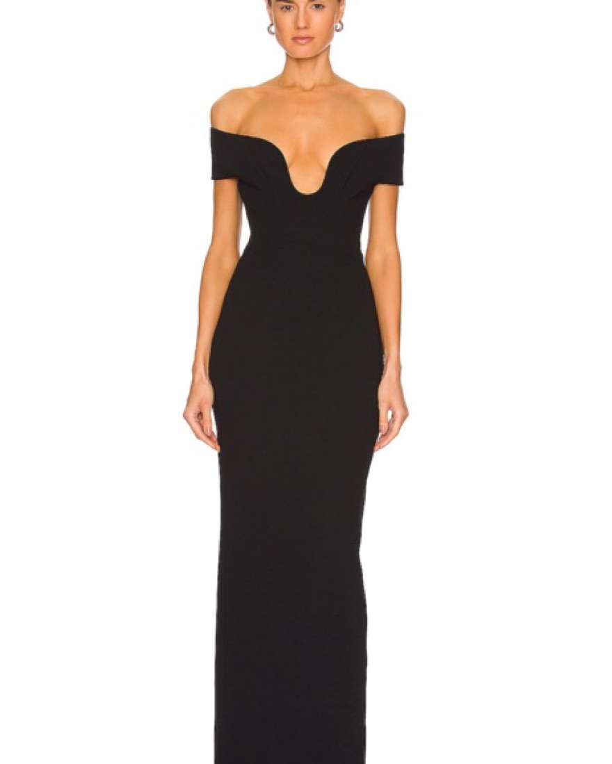 Black off the shoulder gown. Thick fabric with structured bodice. Very flattering!! Perfect fall / winter wedding guest dress