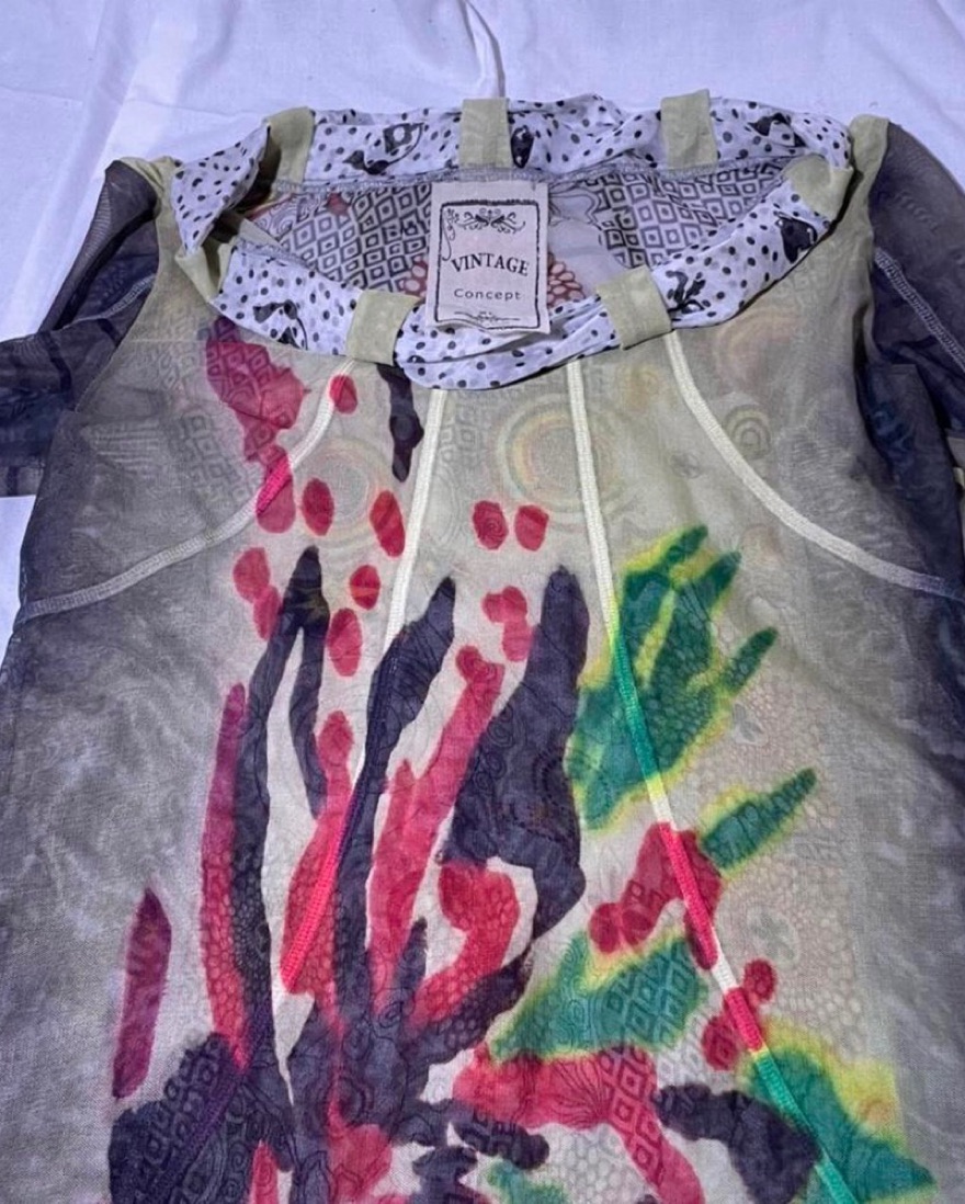 Perfect condition dress. I wore it as a shirt but it can be worn as a dress as well. It is sheer, but anything that goes under it will be suitable. It is an extremely unique piece. It is a Large, but I am usually a small and it fits fine.