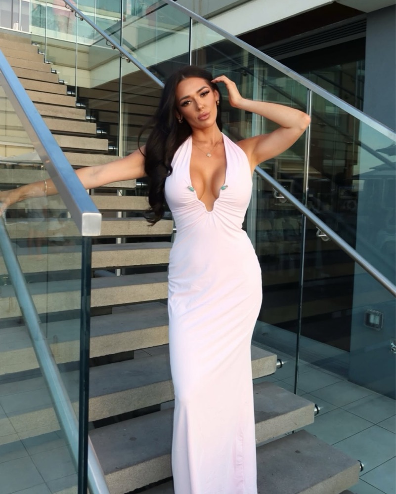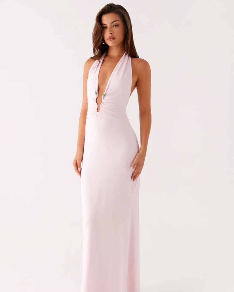 The Nicola Maxi Dress is an effortlessly elegant piece, featuring a flattering low V-neckline and a ruched front that enhances the silhouette. Its sleek design and form-fitting structure make it perfect for formal events or special occasions, offering both style and comfort in one stunning dress.